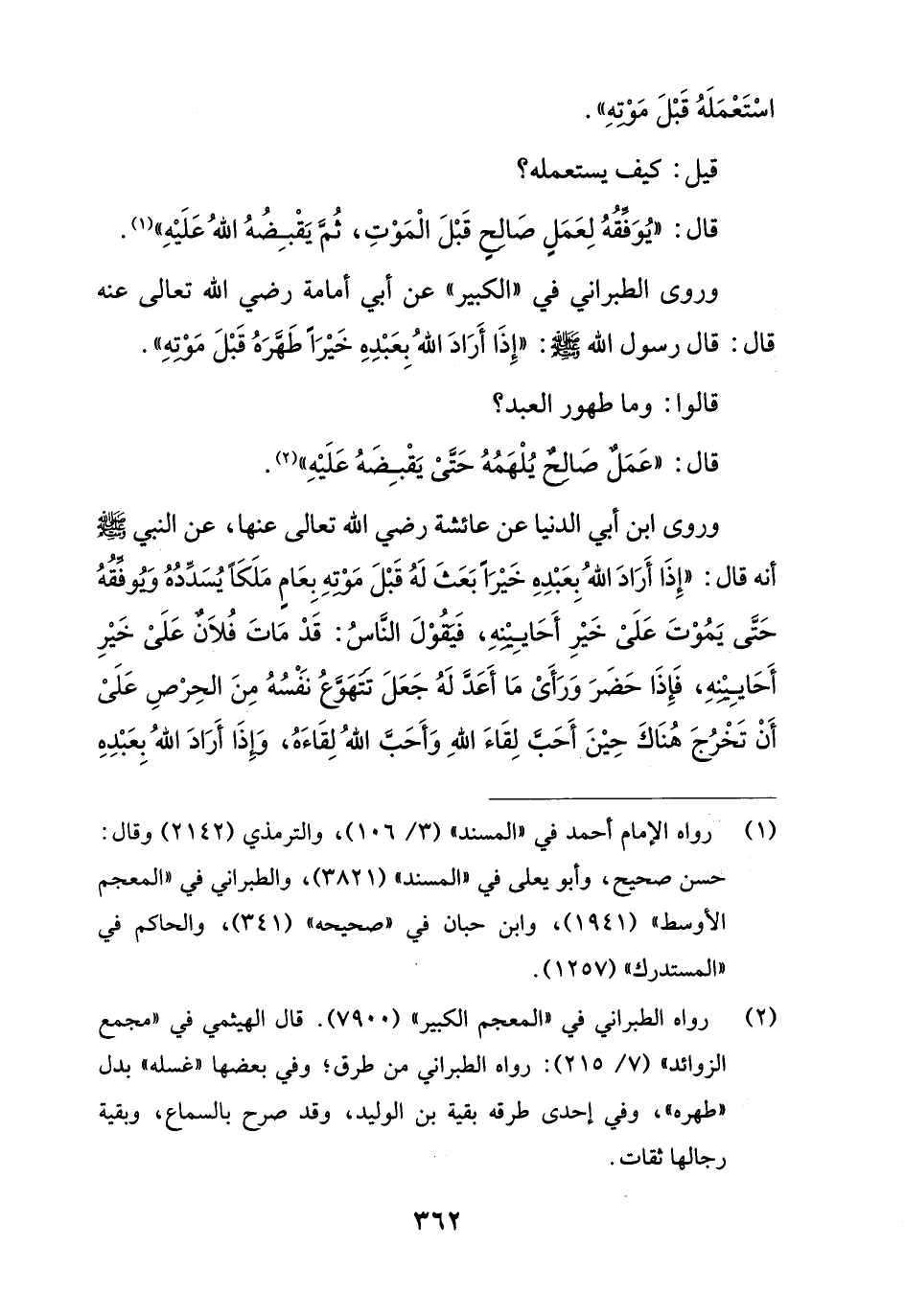 قال: "يُوَفِّقُهُ لِعَمَلِ صالحٍ قَبْلَ الْمَوْتِ، ثُمَّ يَقْبِضُهُ اللهُ عَلَيْهِ" (¬1).