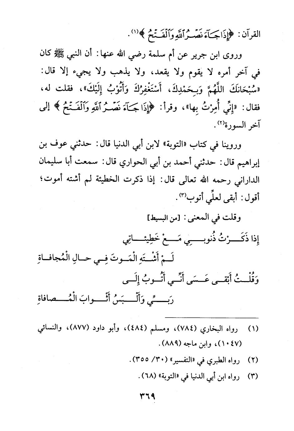 وروى ابن جرير عن أم سلمة رضي الله عنها: أن النبي - صلى الله عليه وسلم - كان في آخر أمره لا يقوم ولا يقعد، ولا يذهب ولا يجيء إلا قال: "سُبْحَانَكَ اللهُمَّ وَبِحَمْدِكَ، أَسْتَغْفِرُكَ وَأتوْبُ إِلَيْكَ"، فقلت له، فقال: "إِنِّي أُمِرْتُ بِها"، وقرأ: {إِذَا جَاءَ نَصْرُ اللَّهِ وَالْفَتْحُ} إلى آخر السورة (¬2).