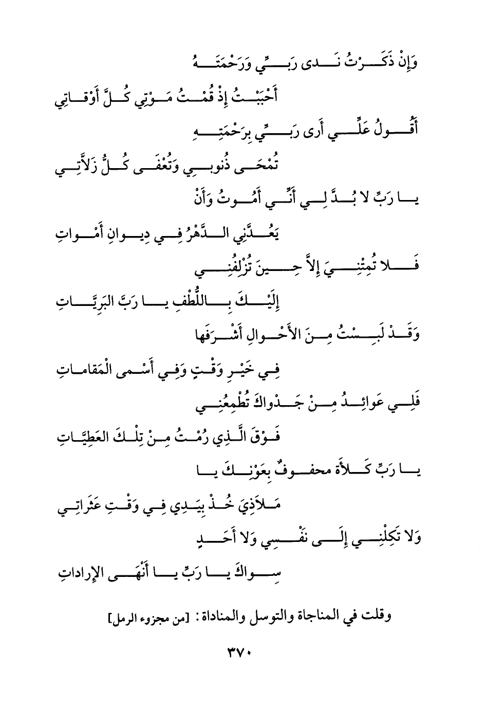 وَلا تَكِلْنِي إِلَى نَفْسِي وَلا أَحَدٍ ... سِواكَ يا رَب يا أَنْهَى الإِراداتِ