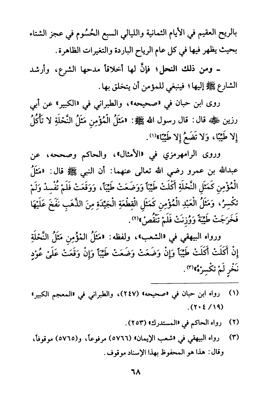 وروى الرامهرمزي في "الأمثال"، والحاكم وصححه، عن عبد الله بن عمرو رضي الله تعالى عنهما: أن النبي - صلى الله عليه وسلم - قال: "مَثَلُ الْمُؤْمِنِ كَمَثَلِ النَّحْلَةِ أَكْلَتْ طَيِّبًا وَوَضَعَتْ طَيِّبًا، وَوَقَعَتْ فَلَمْ تُفْسِدْ وَلَمْ تكْسِرُ، وَمَثَلُ الْعَبْدِ الْمُؤْمِنِ كَمَثَلِ الْقِطْعَةِ الْجَيِّدَةِ مِنَ الذهَبِ نَفَخَ عَلَيْهَا فَخَرَجَتْ طَيِّبَةً وَوزِنَتْ فَلَمْ تَنقُصْ" (¬2).