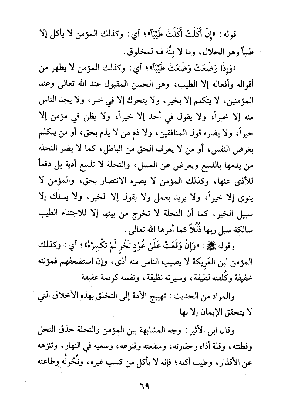 وقال ابن الأثير: وجه المشابهة بين المؤمن والنحلة حذق النحل وفطنته، وقلة أذاه وحقارته، ومنفعته وقنوعه، وسعيه في النهار، وتنزهه عن الأقذار، وطيب أكله؛ فإنه لا يأكل من كسب غيره، ونُحُولُه وطاعته