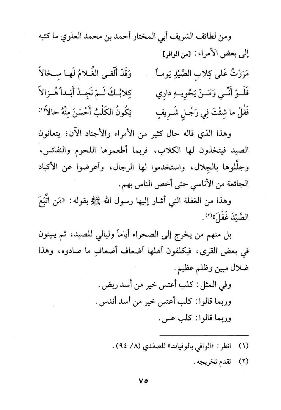 وهذا الذي قاله حال كثير من الأمراء والأجناد الآن؛ يتعانون الصيد فيتخذون لها الكلاب، فربما أطعموها اللحوم والنفائس، وجلَّلوها بالجِلال، واستخدموا لها الرجال، وأعرضوا عن الأكباد الجائعة من الأناسي حتى أخص الناس بهم.