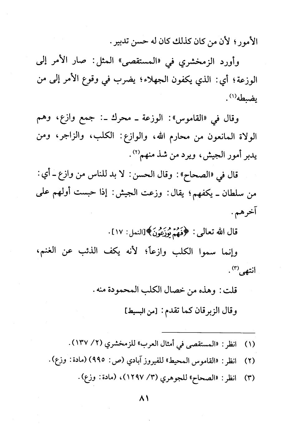 وقال في "القاموس": الوزعة - محرك -: جمع وازع، وهم الولاة المانعون من محارم الله، والوازع: الكلب، والزاجر، ومن يدبر أمور الجيش، ويرد من شذ منهم (¬2).