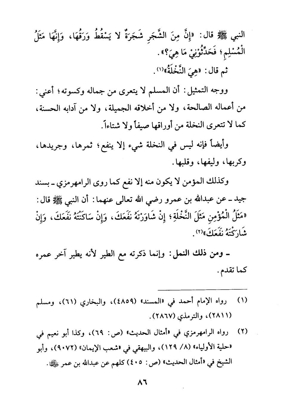 وكذلك المؤمن لا يكون منه إلا نفع كما روى الرامهرمزي - بسند جيد - عن عبد الله بن عمرو رضي الله تعالى عنهما: أن النبي - صلى الله عليه وسلم - قال: "مَثَلُ الْمُؤْمِنِ مَثَلَ النَّخْلَةِ؛ إِنْ شَاوَرْتَهُ نَفَعَكَ، وَإِنْ سَاكَنْتَهُ نَفَعَكَ، وَإِنْ شَارَكْتَهُ نَفَعَكَ" (¬2).