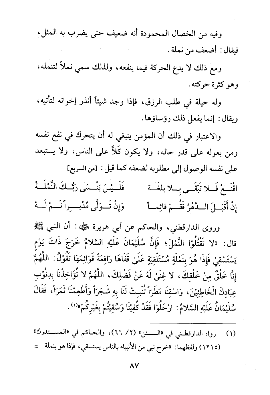 وروى الدارقطني، والحاكم عن أبي هريرة - رضي الله عنه -: أن النبي - صلى الله عليه وسلم - قال: "لا تَقْتُلُوْا النَّمْلَ؛ فَإِنَّ سُلَيْمَانَ عَلَيْهِ السَّلامُ خَرَجَ ذَاتَ يَوْمٍ يَسْتَسْقِيْ فَإِذَا هُوَ بِنَمْلَةٍ مُسْتَلْقِيَةٍ عَلَىْ قَفَاهَا رَافِعَةً قَوَائِمَهَا تَقُوْلُ: اللَّهُمَّ إِنَّا خَلْقٌ مِنْ خَلْقِكَ، لا غِنَىْ لَهُ عَنْ فَضْلِكَ، اللَّهُمَّ لا تُؤَاخِذْنَا بِذِنُوْبِ عِبَادِكَ الْخَاطِئِيْنَ، وَاسْقِنَا مَطَرًا تُنْبِتْ لَنَا بِهِ شَجَرًا وَأَطْعِمْنَا ثَمَرًا، فَقَالَ سُلَيْمَانُ عَلَيْهِ السَّلامُ: ارْحَلُوْا فَقَدْ كُفِيْنَا وَسُقِيْتُمْ بِغَيْرِكُمْ" (¬1).