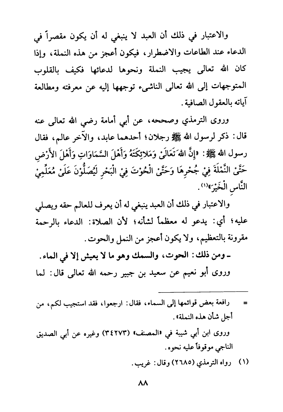 والاعتبار في ذلك أن العبد ينبغي له أن يعرف للعالم حقه ويصلي عليه؛ أي: يدعو له معظماً لشأنه؛ لأن الصلاة: الدعاء بالرحمة مقرونة بالتعظيم، ولا يكون أعجز من النمل والحوت.
