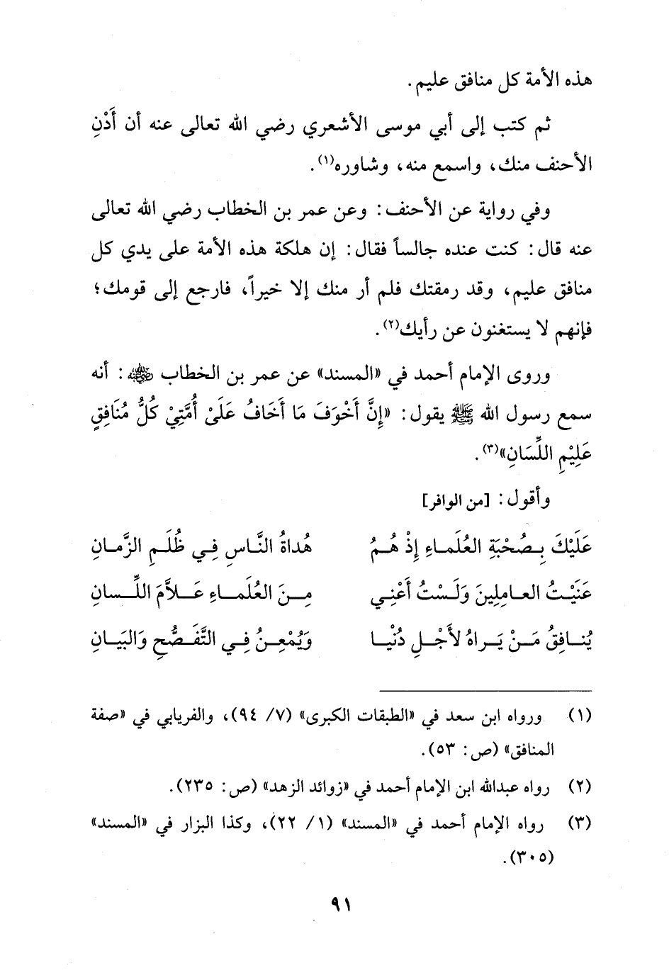 وروى الإمام أحمد في "المسند" عن عمر بن الخطاب - رضي الله عنه -: أنه سمع رسول الله - صلى الله عليه وسلم - يقول: "إِنَّ أَخْوَفَ مَا أَخَافُ عَلَىْ أُمَّتِيْ كُلُّ مُنَافِقٍ عَلِيْمِ اللِّسَانِ" (¬3).