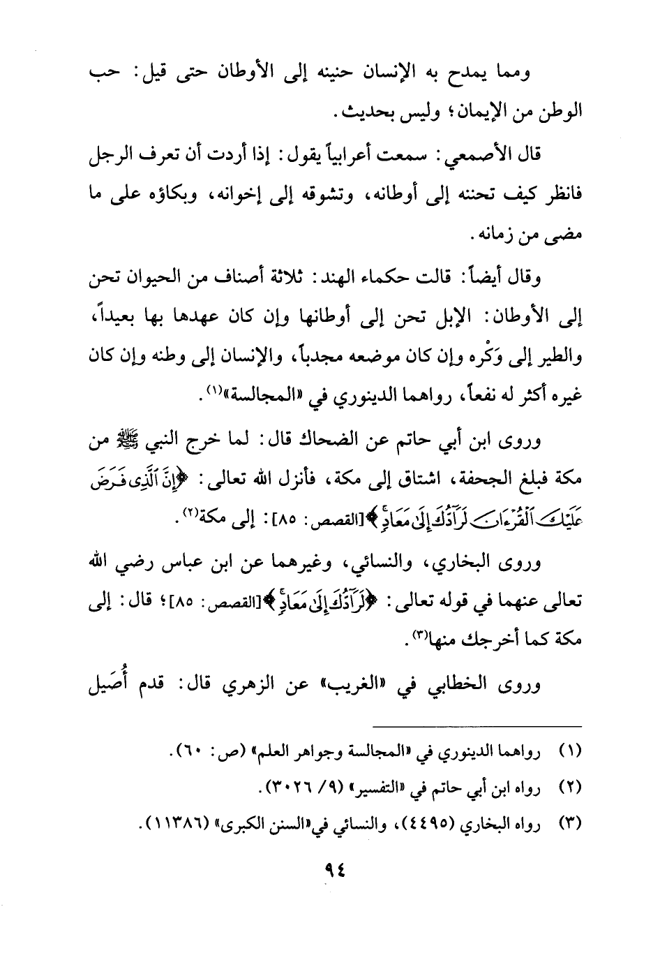 وقال أيضاً: قالت حكماء الهند: ثلاثة أصناف من الحيوان تحن إلى الأوطان: الإبل تحن إلى أوطانها وإن كان عهدها بها بعيداً، والطير إلى وَكْره وإن كان موضعه مجدباً، والإنسان إلى وطنه وإن كان غيره أكثر له نفعاً، رواهما الدينوري في "المجالسة" (¬1).