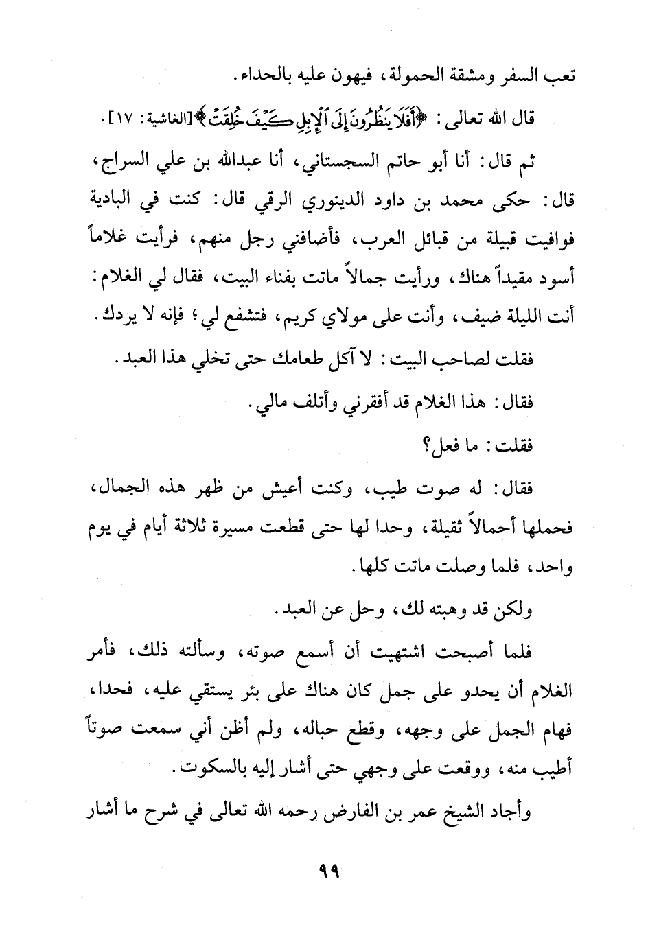 ثم قال: أنا أبو حاتم السجستاني، أنا عبد الله بن علي السراج، قال: حكى محمد بن داود الدينوري الرقي قال: كنت في البادية فوافيت قبيلة من قبائل العرب، فأضافني رجل منهم، فرأيت غلاماً أسود مقيداً هناك، ورأيت جمالاً ماتت بفناء البيت، فقال لي الغلام: أنت الليلة ضيف، وأنت على مولاي كريم، فتشفع لي؛ فإنه لا يردك.
