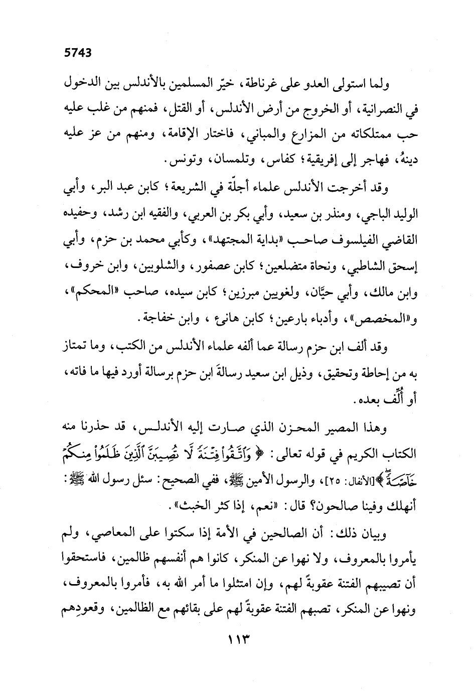 وهذا المصير المحزن الذي صارت إليه الأندلس، قد حذرنا منه الكتاب الكريم في قوله تعالى: {وَاتَّقُوا فِتْنَةً لَا تُصِيبَنَّ الَّذِينَ ظَلَمُوا مِنْكُمْ خَاصَّةً} [الأنفال: 25]، والرسول الأمين - صلى الله عليه وسلم -، ففي الصحيح: سئل رسول الله - صلى الله عليه وسلم -: أنهلك وفينا صالحون؟ قال: "نعم، إذا كثر الخبث".