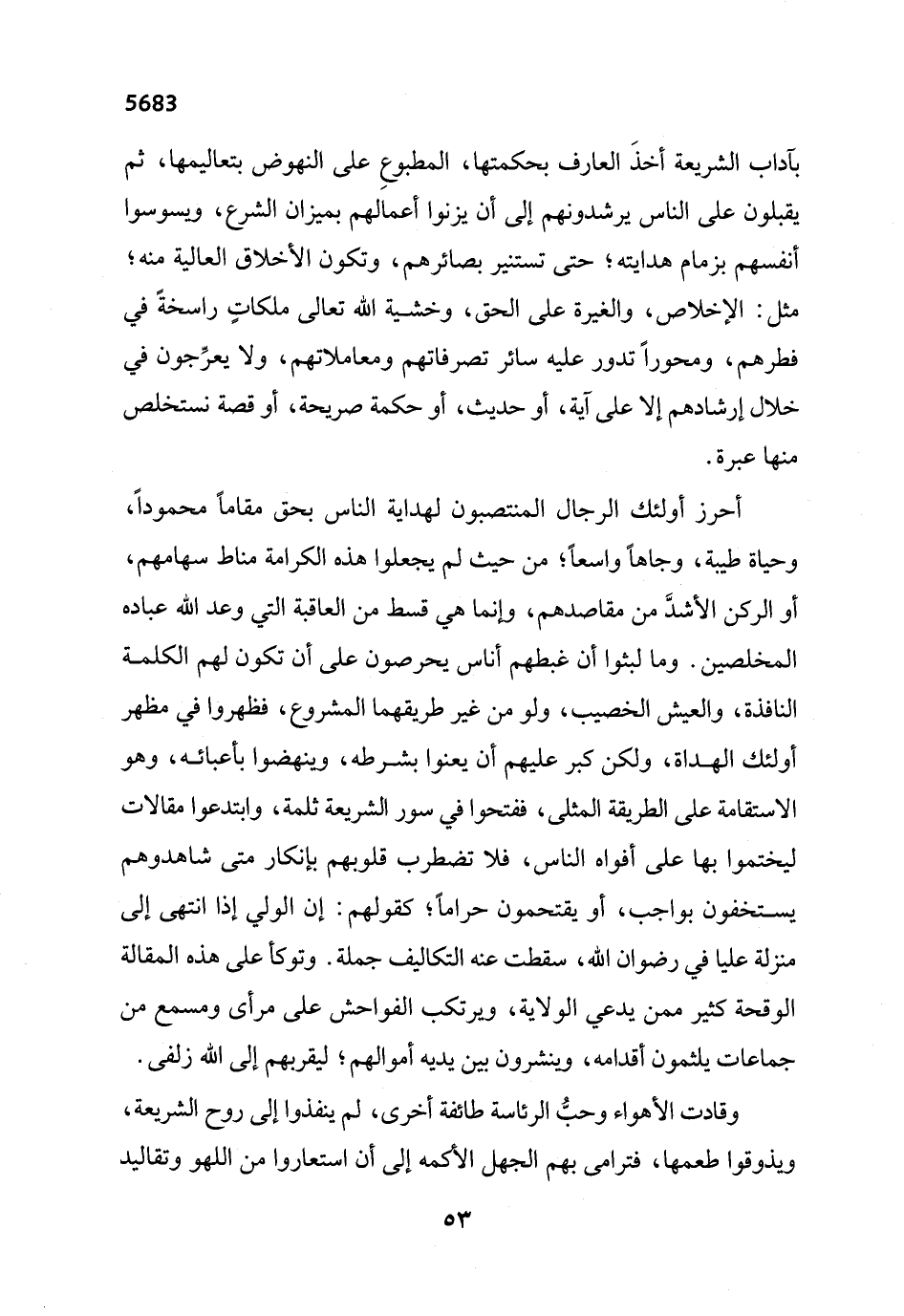 أحرز أولئك الرجال المنتصبون لهداية الناس بحق مقاماً محموداً، وحياة طيبة، وجاهاً واسعاً؛ من حيث لم يجعلوا هذه الكرامة مناط سهامهم، أو الركن الأشدَّ من مقاصدهم، وإنما هي قسط من العاقبة التي وعد الله عباده المخلصين. وما لبثوا أن غبطهم أناس يحرصون على أن تكون لهم الكلمة النافذة، والعيش الخصيب، ولو من غير طريقهما المشروع، فظهروا في مظهر أولئك الهداة، ولكن أكبر عليهم أن يعنوا بشرطه، وينهضوا بأعبائه، وهو الاستقامة على الطريقة المثلى، ففتحوا في سور الشريعة ثلمة، وابتدعوا مقالات ليختموا بها على أفواه الناس، فلا تضطرب قلوبهم بإنكار متى شاهدوهم يستخفون بواجب، أو يقتحمون حراماً؛ كقولهم: إن الولي إذا انتهى إلى منزلة عليا في رضوان الله، سقطت عنه التكاليف جملة. وتوكأ على هذه المقالة الوقحة كثير ممن يدعي الولاية، ويرتكب الفواحش على مرأى ومسمع من جماعات يلثمون أقدامه، وينشرون بين يديه أموالهم؛ ليقربهم إلى الله زلفى.