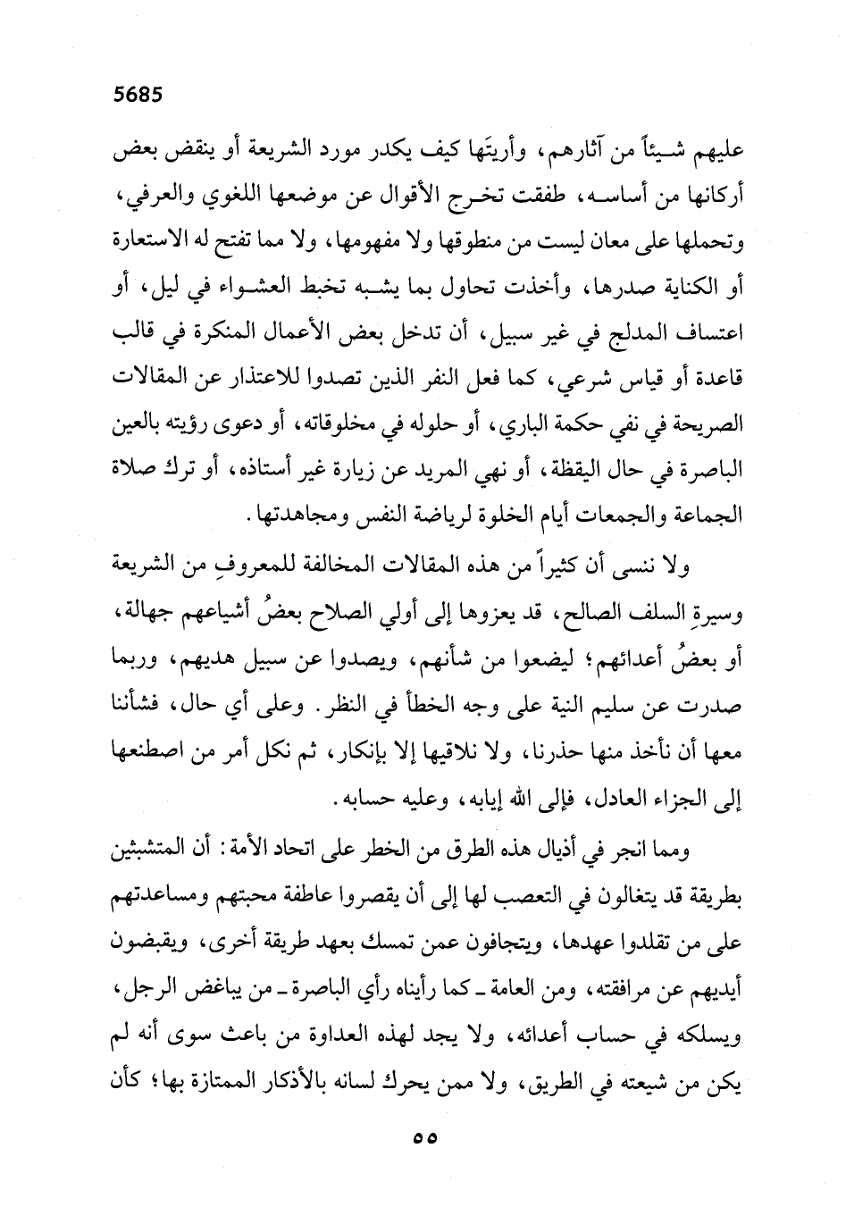 عليهم شيئاً من آثارهم، وأريتَها كيف يكدر مورد الشريعة أو ينقض بعض أركانها من أساسه، طفقت تخرج الأقوال عن موضعها اللغوي والعرفي، وتحملها على معان ليست من منطوقها ولا مفهومها، ولا مما تفتح له الاستعارة أو الكناية صدرها، وأخذت تحاول بما يشبه تخبط العشواء في ليل، أو اعتساف المدلج في غير سبيل، أن تدخل بعض الأعمال المنكرة في قالب قاعدة أو قياس شرعي، كما فعل النفر الذين تصدوا للاعتذار عن المقالات الصريحة في نفي حكمة الباري، أو حلوله في مخلوقاته، أو دعوى رؤيته بالعين الباصرة في حال اليقظة، أو نهي المريد عن زيارة غير أستاذه، أو ترك صلاة الجماعة والجمعات أيام الخلوة لرياضة النفس ومجاهدتها.