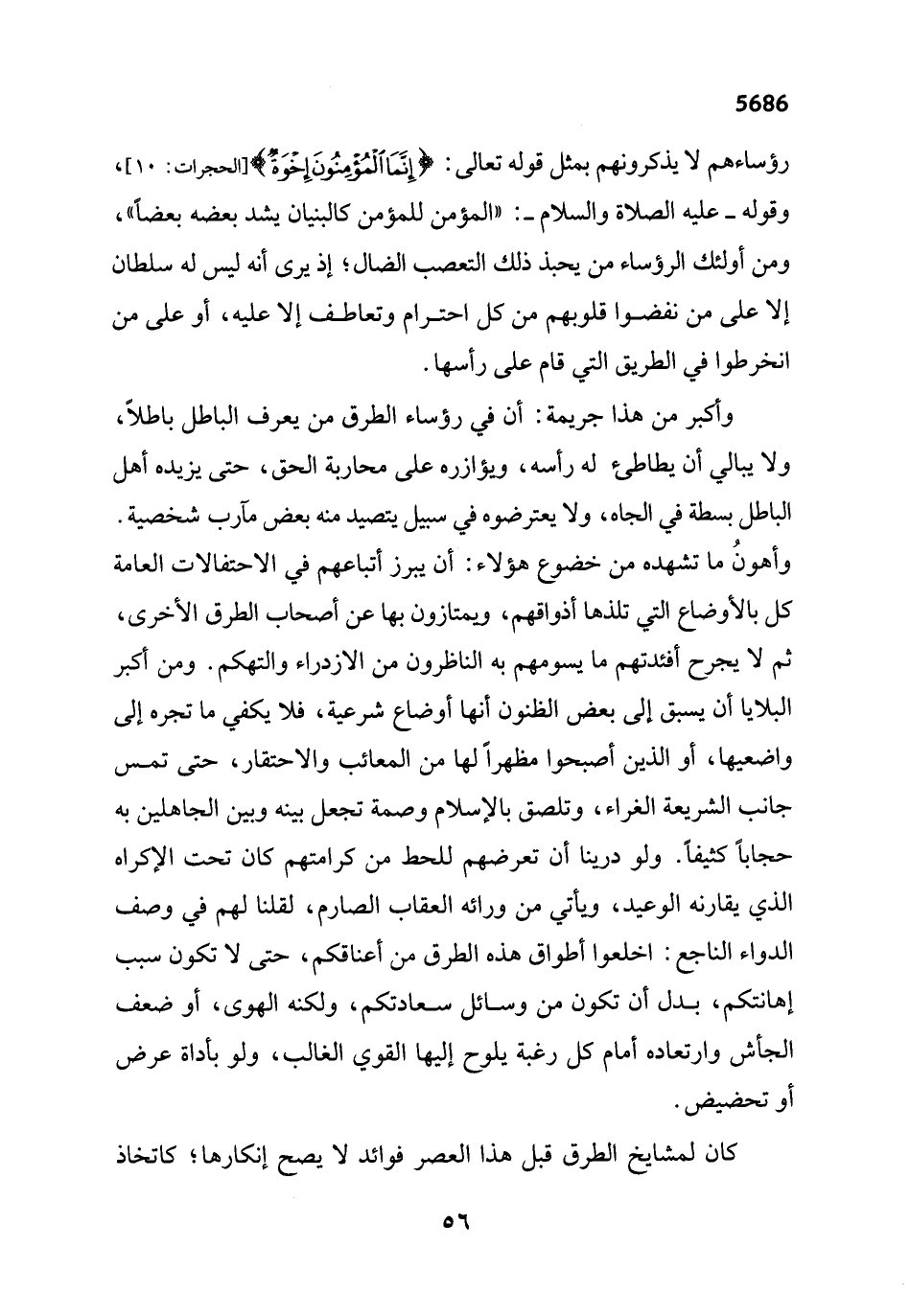 وأكبر من هذا جريمة: أن في رؤساء الطرق من يعرف الباطل باطلاً، ولا يبالي أن يطاطئ له رأسه، ويؤازره على محاربة الحق، حتى يزيده أهل الباطل بسطة في الجاه، ولا يعترضوه في سبيل يتصيد منه بعض مآرب شخصية. وأهونُ ما تشهده من خضوع هؤلاء: أن يبرز أتباعهم في الاحتفالات العامة كل بالأوضاع التي تلذها أذواقهم، ويمتازون بها عن أصحاب الطرق الأخرى، ثم لا يجرح أفئدتهم ما يسومهم به الناظرون من الازدراء والتهكم. ومن أكبر البلايا أن يسبق إلى بعض الظنون أنها أوضاع شرعية، فلا يكفي ما تجره إلى واضعيها، أو الذين أصبحوا مظهراً لها من المعائب والاحتقار، حتى تمس جانب الشريعة الغراء، وتلصق بالإسلام وصمة تجعل بينه وبين الجاهلين به حجاباً كثيفاً. ولو درينا أن تعرضهم للحط من كرامتهم كان تحت الإكراه الذي يقارنه الوعيد، ويأتي من ورائه العقاب الصارم، لقلنا لهم في وصف الدواء الناجع: اخلعوا أطواق هذه الطرق من أعناقكم، حتى لا تكون سبب إهانتكم، بدل أن تكون من وسائل سعادتكم، ولكنه الهوى، أو ضعف الجأش وارتعاده أمام كل رغبة يلوح إليها القوي الغالب، ولو بأداة عرض أو تحضيض.
