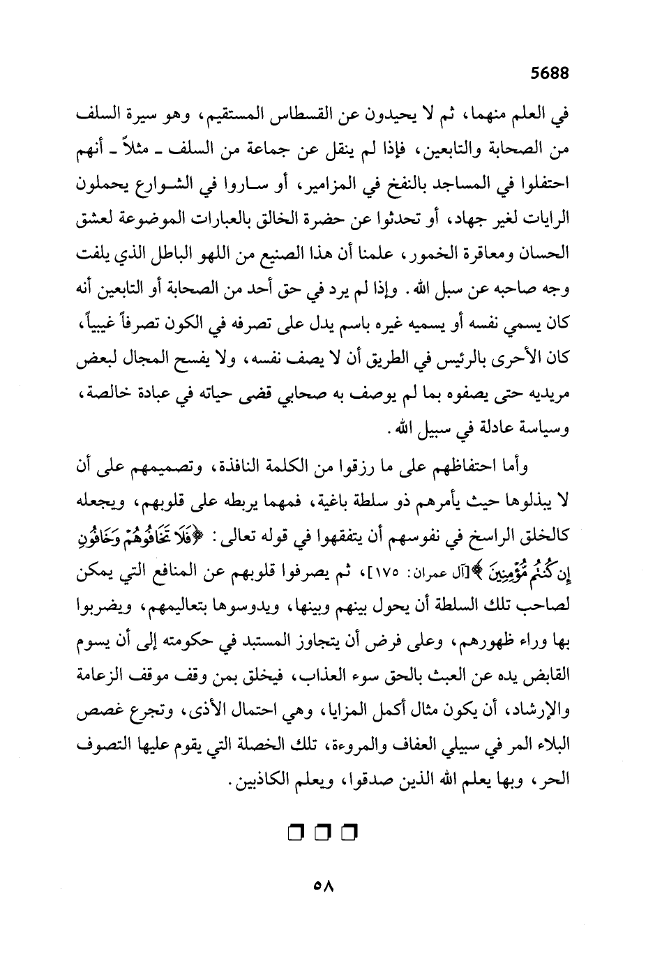 في العلم منهما، ثم لا يحيدون عن القسطاس المستقيم، وهو سيرة السلف من الصحابة والتابعين، فإذا لم ينقل عن جماعة من السلف -مثلاً- أنهم احتفلوا في المساجد بالنفخ في المزامير، أو ساروا في الشوارع يحملون الرايات لغير جهاد، أو تحدثوا عن حضرة الخالق بالعبارات الموضوعة لعشق الحسان ومعاقرة الخمور، علمنا أن هذا الصنيع من اللهو الباطل الذي يلفت وجه صاحبه عن سبل الله. وإذا لم يرد في حق أحد من الصحابة أو التابعين أنه كان يسمي نفسه أو يسميه غيره باسم يدل على تصرفه في الكون تصرفًا غيبياً، كان الأحرى بالرئيس في الطريق أن لا يصف نفسه، ولا يفسح المجال لبعض مريديه حتى يصفوه بما لم يوصف به صحابي قضى حياته في عبادة خالصة، وسياسة عادلة في سبيل الله.