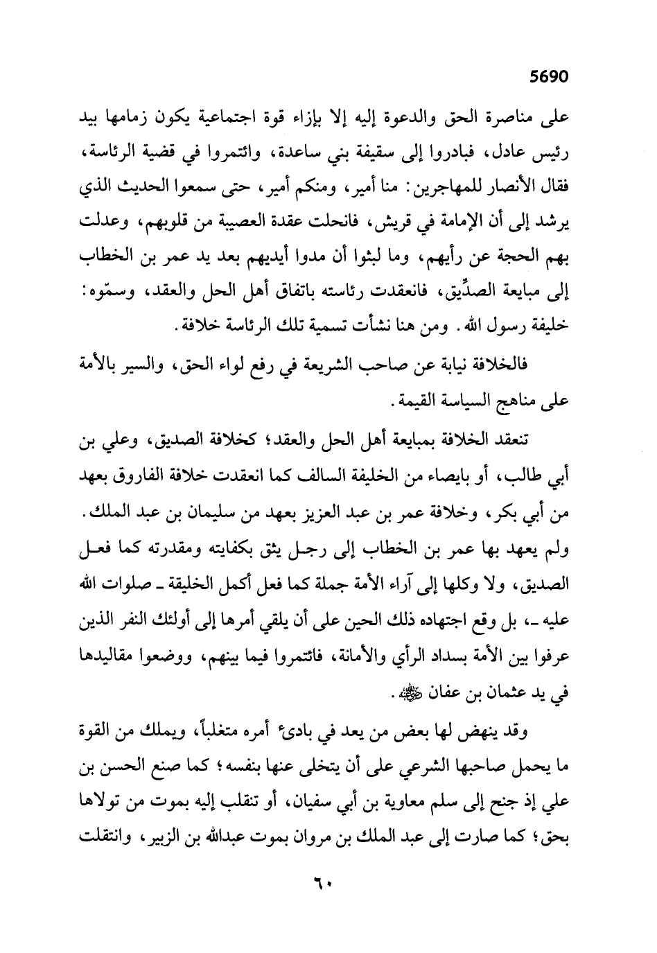 على مناصرة الحق والدعوة إليه إلا بإزاء قوة اجتماعية يكون زمامها بيد رئيس عادل، فبادروا إلى سقيفة بني ساعدة، وائتمروا في قضية الرئاسة، فقال الأنصار للمهاجرين: منا أمير، ومنكم أمير، حتى سمعوا الحديث الذي يرشد إلى أن الإمامة في قريش، فانحلت عقدة العصيبة من قلوبهم، وعدلت بهم الحجة عن رأيهم، وما لبثوا أن مدوا أيديهم بعد يد عمر بن الخطاب إلى مبايعة الصدِّيق، فانعقدت رئاسته باتفاق أهل الحل والعقد، وسمّوه: خليفة رسول الله. ومن هنا نشأت تسمية تلك الرئاسة خلافة.