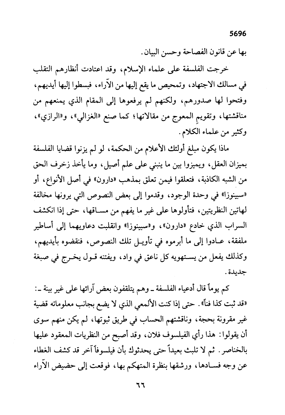 ماذا يكون مبلغ أولئك الأعلام من الحكمة، لو لم يزنوا قضايا الفلسفة بميزان العقل، ويميزوا بين ما ينبني على علم أصيل، وما يأخذ زخرف الحق من الشبه الكاذبة، فتعلقوا فيمن تعلق بمذهب "دارون" في أصل الأنواع، أو "سبينوزا" في وحدة الوجود، وقدموا إلى بعض النصوص التي يرونها مخالفة لهاتين النظريتين، فتأولوها على غير ما يفهم من مساقها، حتى إذا انكشف السراب الذي خادع "دارون"، و"سبينوزا" وانقلبت دعاويهما إلى أساطير ملفقة، عادوا إلى ما أبرموه في تأويل تلك النصوص، فنقضوه بأيديهم، وكذلك يفعل من يستهويه كل ناعق في واد، ويفتنه قول يخرج في صبغة جديدة.