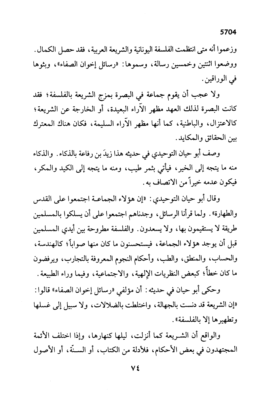 وحكى أبو حيان في حديثه: أن مؤلفي "رسائل إخوان الصفاء" قالوا: "إن الشريعة قد في نست بالجهالة، واختلطت بالضلالات، ولا سبيل إلى غسلها وتطهيرها إلا بالفلسفة".