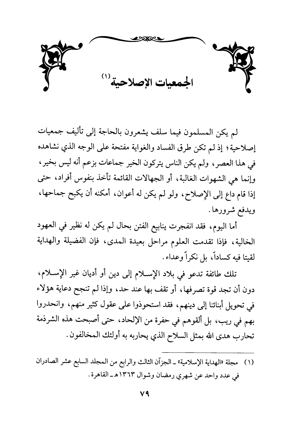 لم يكن المسلمون فيما سلف يشعرون بالحاجة إلى تأليف جمعيات إصلاحية؛ إذ لم تكن طرق الفساد والغواية مفتحة على الوجه الذي نشاهده في هذا العصر، ولم يكن الناس يتركون الخير جماعات بزعم أنه ليس بخير، وإنما هي الشهوات الغالبة، أو الجهالات القائمة تأخذ بنفوس أفراد، حتى إذا قام دل إلى الإِصلاح، ولو لم يكن له أعوان، أمكنه أن يكبح جماحها، ويدفع شرورها.