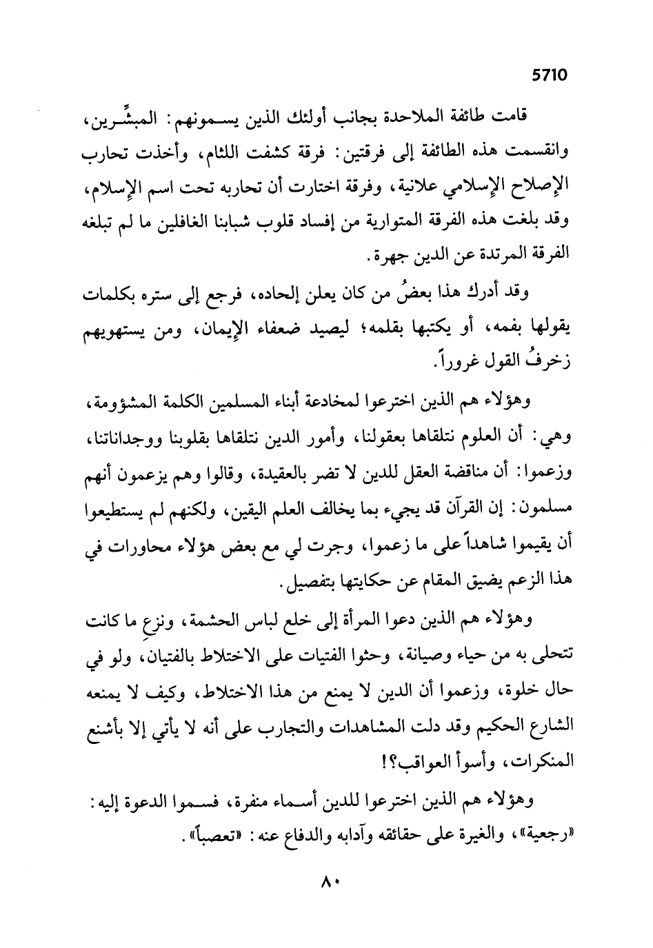 قامت طائفة الملاحدة بجانب أولئك الذين يسمونهم: المبشِّرين، وانقسمت هذه الطائفة إلى فرقتين: فرقة كشفت اللثام، وأخذت تحارب الإِصلاح الإِسلامي علانية، وفرقة اختارت أن تحاربه تحت اسم الإِسلام، وقد بلغت هذه الفرقة المتوارية من إفساد قلوب شبابنا الغافلين ما لم تبلغه الفرقة المرتدة عن الدين جهرة.