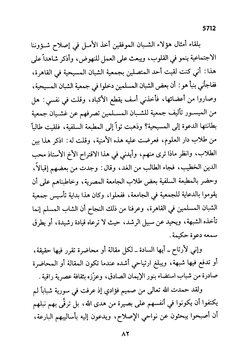 وإني لأرتاح -أيها السادة- لكل مقالة أو محاضرة تقرر فيها حقيقة، أو تدفع فيها شبهة، ويبلغ ارتياحي أشده عندما تكون المقالة أو المحاضرة صادرة من شباب استضاء بنور الإيمان الصادق، وعزّزه بثقافة عصرية راقية.