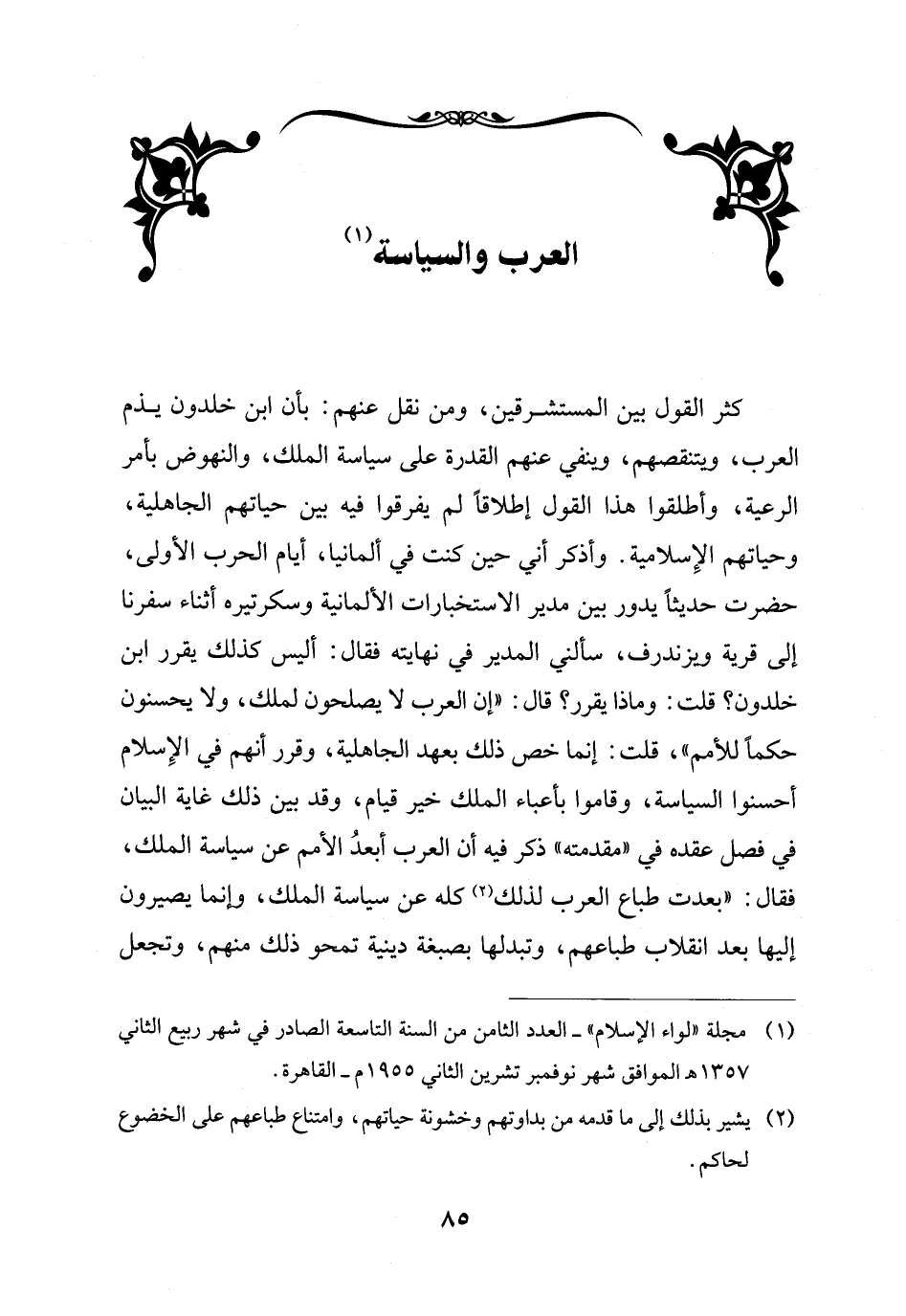 كثر القول بين المستشرقين، ومن نقل عنهم: بأن ابن خلدون يذم العرب، ويتنقصهم، وينفي عنهم القدرة على سياسة الملك، والنهوض بأمر الرعية، وأطلقوا هذا القول إطلاقاً لم يفرقوا فيه بين حياتهم الجاهلية، وحياتهم الإِسلامية. وأذكر أني حين كنت في ألمانيا، أيام الحرب الأولى، حضرت حديثاً يدور بين مدير الاستخبارات الألمانية وسكرتيره أثناء سفرنا إلى قرية ويزندرف، سألني المدير في نهايته فقال: أليس كذلك يقرر ابن خلدون؟ قلت: وماذا يقرر؟ قال: "إن العرب لا يصلحون لملك، ولا يحسنون حكماً للأمم"، قلت: إنما خص ذلك بعهد الجاهلية، وقرر أنهم في الإِسلام أحسنوا السياسة، وقاموا بأعباء الملك خير قيام، وقد بين ذلك غاية البيان في فصل عقده في "مقدمته" ذكر فيه أن العرب أبعدُ الأمم عن سياسة الملك، فقال: "بعدت طباع العرب لذلك (¬2) كله عن سياسة الملك، وإنما يصيرون إليها بعد انقلاب طباعهم، وتبدلها بصبغة دينية تمحو ذلك منهم، وتجعل