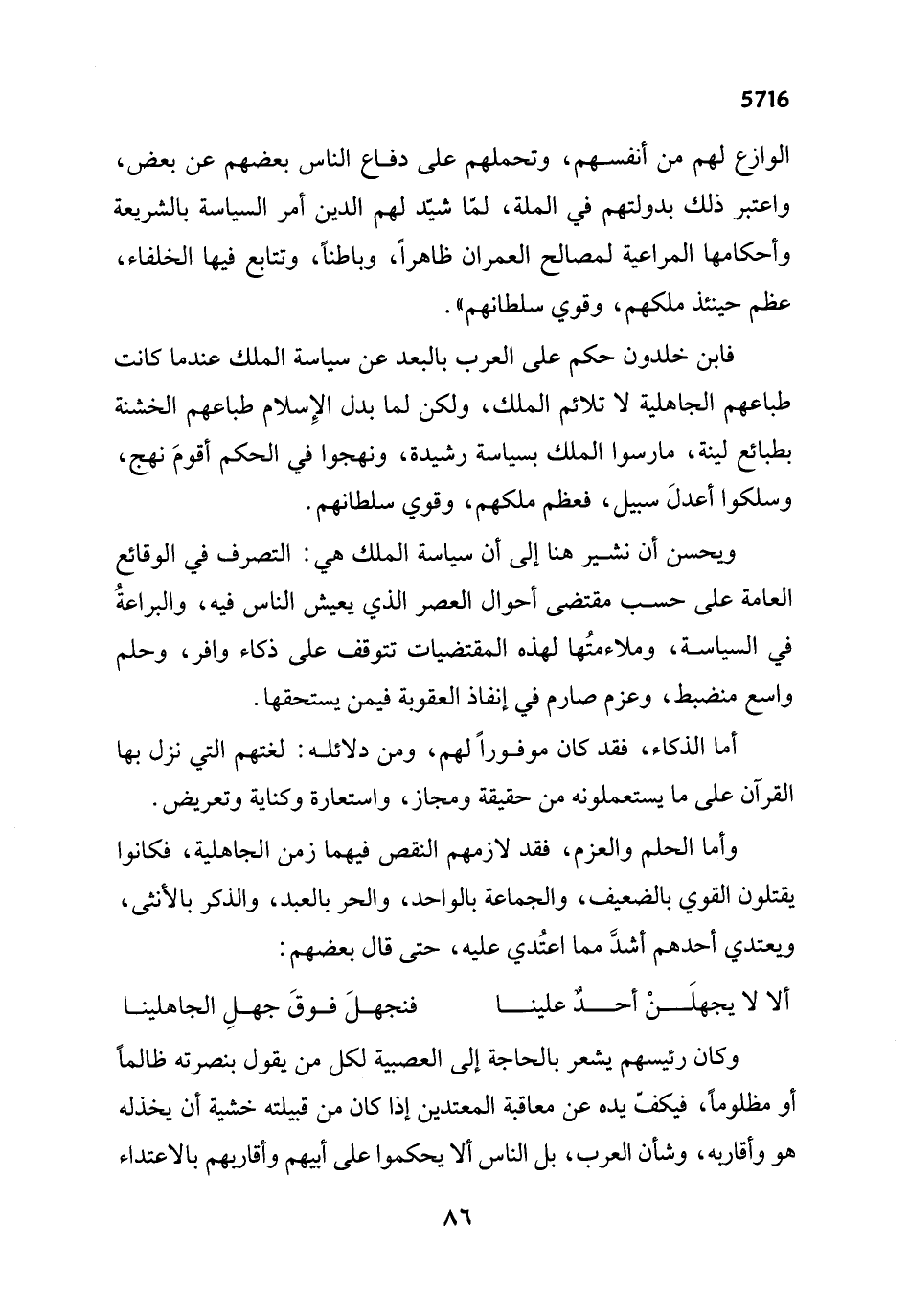 الوازع لهم من أنفسهم، وتحملهم على دفاع الناس بعضهم عن بعض، واعتبر ذلك بدولتهم في الملة، لمّا شيّد لهم الدين أمر السياسة بالشريعة وأحكامها المراعية لمصالح العمران ظاهراً، وباطناً، وتتابع فيها الخلفاء، عظم حينئذ ملكهم، وقوي سلطانهم".