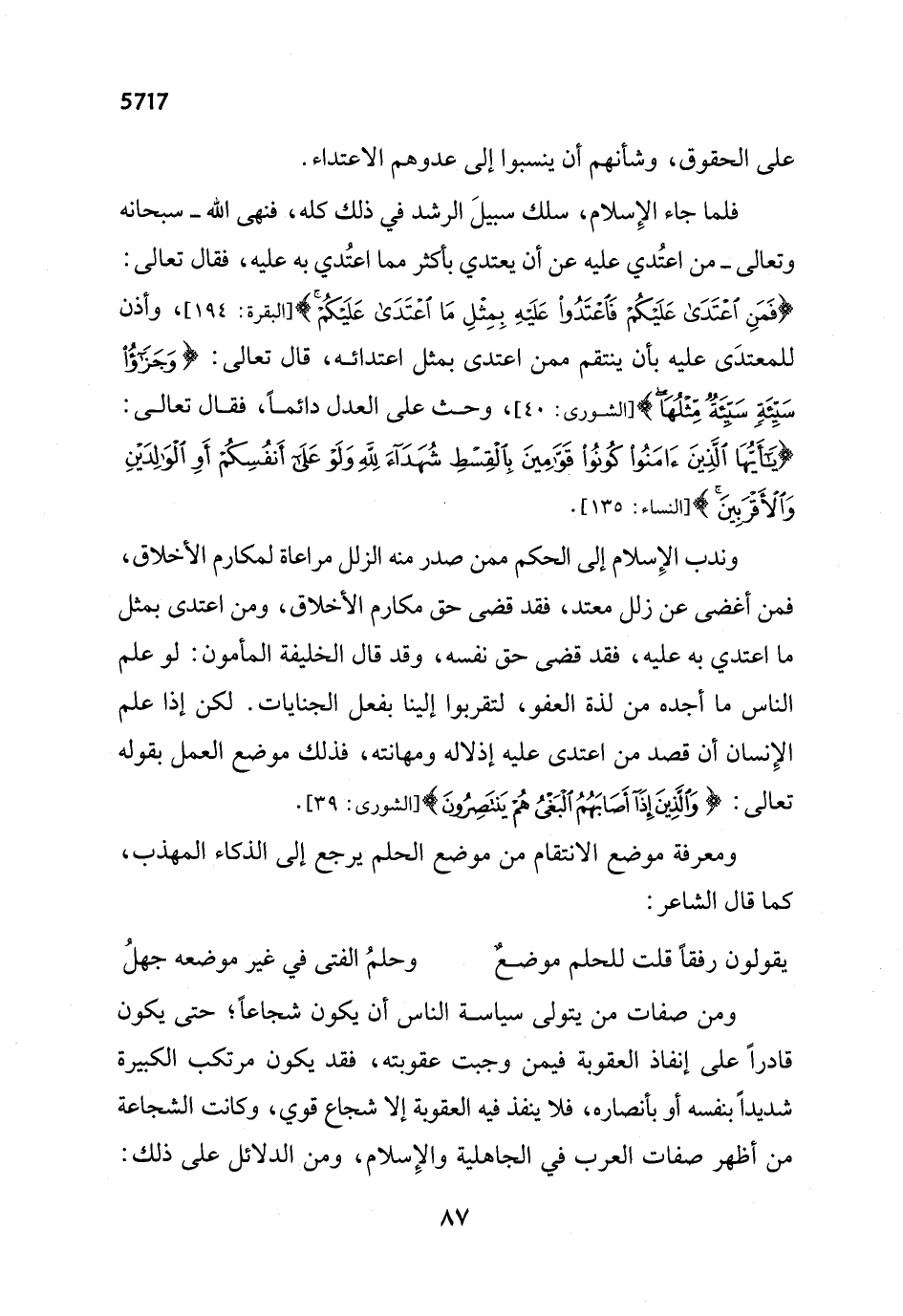 فلما جاء الإِسلام، سلك سبيلَ الرشد في ذلك كله، فنهى الله -سبحانه وتعالى- من اعتُدي عليه عن أن يعتدي بأكثر مما اعتُدي به عليه، فقال تعالى: {فَمَنِ اعْتَدَى عَلَيْكُمْ فَاعْتَدُوا عَلَيْهِ بِمِثْلِ مَا اعْتَدَى عَلَيْكُمْ} [البقرة: 194]، وأذن للمعتدَى عليه بأن ينتقم ممن اعتدى بمثل اعتدائه، قال تعالى: {وَجَزَاءُ سَيِّئَةٍ سَيِّئَةٌ مِثْلُهَا} [الشورى: 40]، وحث على العدل دائماً، فقال تعالى: {يَا أَيُّهَا الَّذِينَ آمَنُوا كُونُوا قَوَّامِينَ بِالْقِسْطِ شُهَدَاءَ لِلَّهِ وَلَوْ عَلَى أَنْفُسِكُمْ أَوِ الْوَالِدَيْنِ وَالْأَقْرَبِينَ} [النساء: 135].
