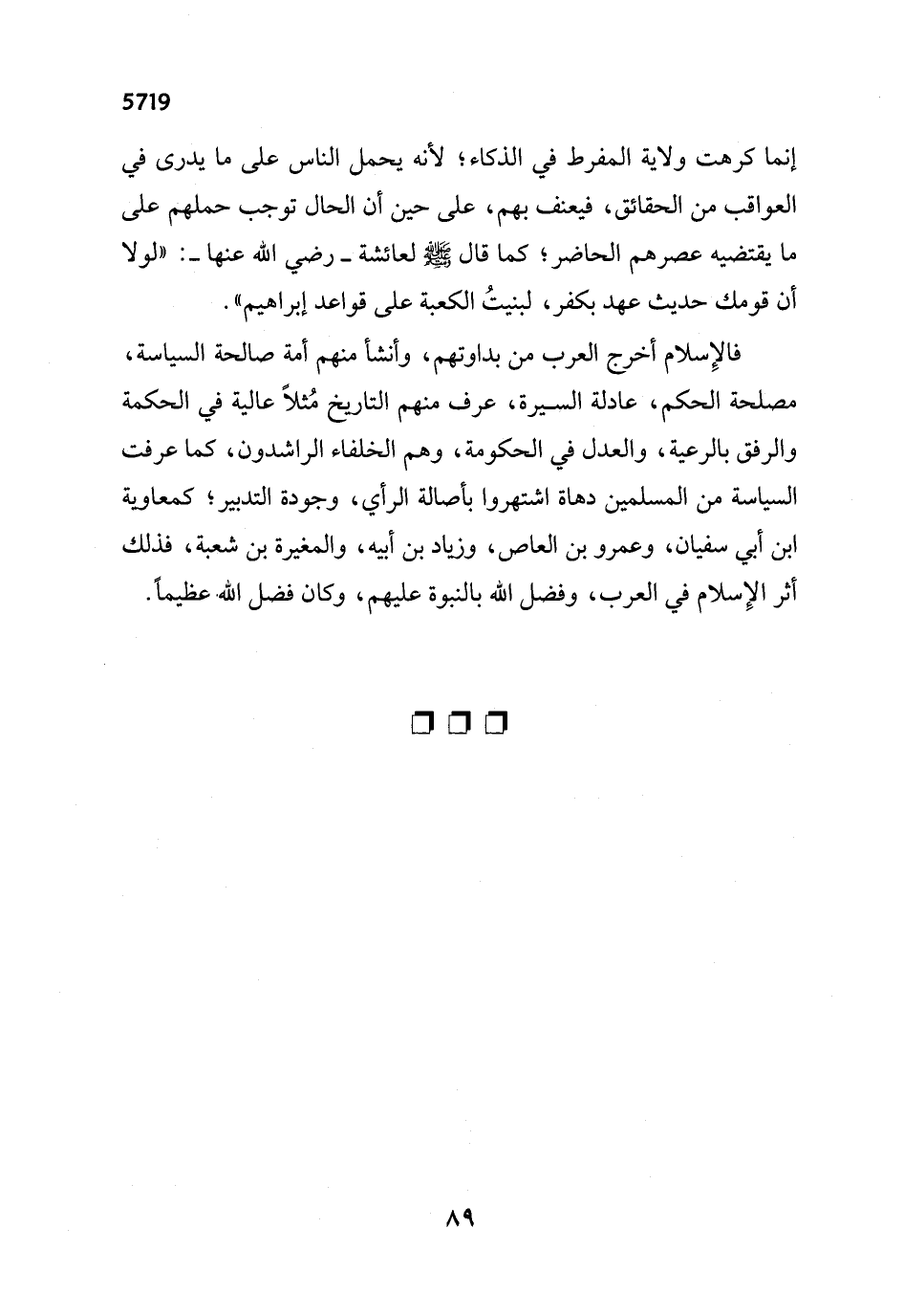 فالإِسلام أخرج العرب من بداوتهم، وأنشأ منهم أمة صالحة السياسة، مصلحة الحكم، عادلة السيرة، عرف منهم التاريخ مُثلاً عالية في الحكمة والرفق بالرعية، والعدل في الحكومة، وهم الخلفاء الراشدون، كما عرفت السياسة من المسلمين دهاة اشتهروا بأصالة الرأي، وجودة التدبير؛ كمعاوية ابن أبي سفيان، وعمرو بن العاص، وزياد بن أبييه، والمغيرة بن شعبة، فذلك أثر الإِسلام في العرب، وفضل الله بالنبوة عليهم، وكان فضل الله عظيماً.