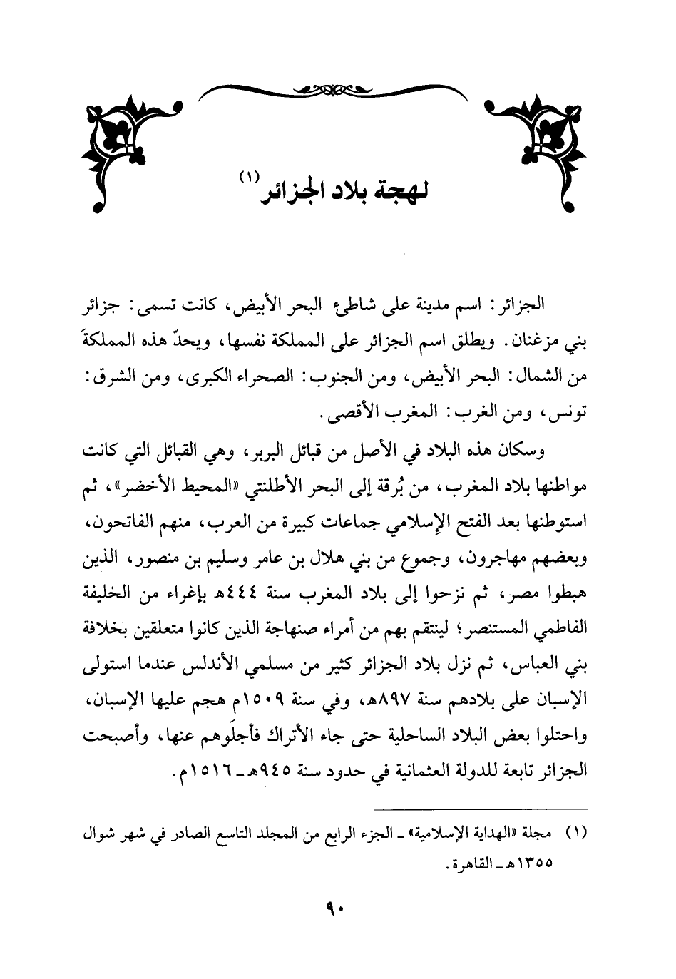 الجزائر: اسم مدينة على شاطئ البحر الأبيض، كانت تسمى: جزائر بني مزغنان. ويطلق اسم الجزائر على المملكة نفسها، ويحدّ هذه المملكةَ من الشمال: البحر الأبيض، ومن الجنوب: الصحراء الكبرى، ومن الشرق: تونس، ومن الغرب: المغرب الأقصى.
