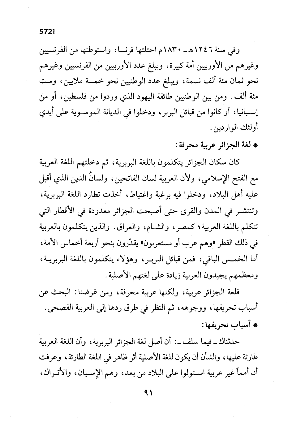 فلغة الجزائر عربية، ولكنها عربية معرفة، ومن غرضنا: البحث عن أسباب تحريفها، ووجوهه، ثم النظر في طرق ردها إلى العربية الفصحى.