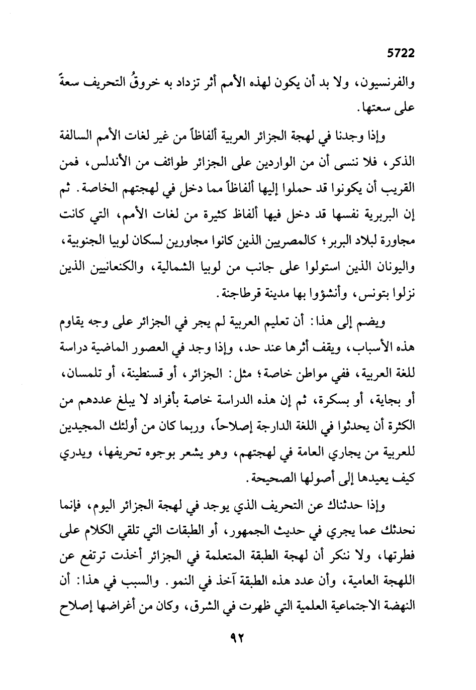 وإذا حدثناك عن التحريف الذي يوجد في لهجة الجزائر اليوم، فإنما نحدثك عما يجري في حديث الجمهور، أو الطبقات التي تلقي الكلام على فطرتها، ولا ننكر أن لهجة الطبقة المتعلمة في الجزائر أخذت ترتفع عن اللهجة العامية، وأن عدد هذه الطبقة آخذ في النمو. والسبب في هذا: أن النهضة الاجتماعية العلمية التي ظهرت في الشرق، وكان من أغراضها إصلاح