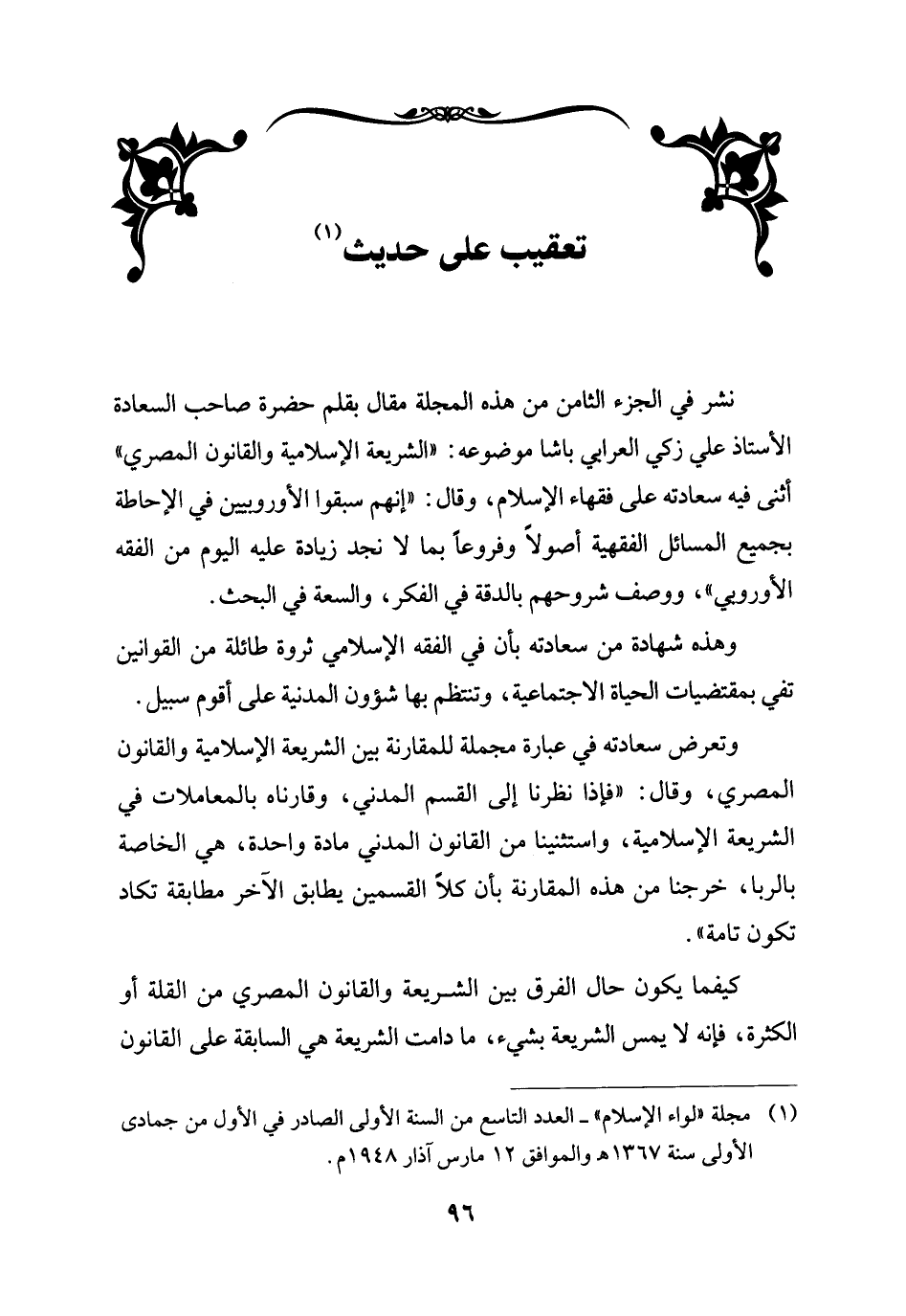 نشر في الجزء الثامن من هذه المجلة مقال بقلم حضرة صاحب السعادة الأستاذ علي زكي العرابي باشا موضوعه: "الشريعة الإسلامية والقانون المصري " أثنى فيه سعادته على فقهاء الإسلام، وقال: "إنهم سبقوا الأوروبيين في الإحاطة بجميع المسائل الفقهية أصولاً وفروعاً بما لا نجد زيادة عليه اليوم من الفقه الأوروبي"، ووصف شروحهم بالدقة في الفكر، والسعة في البحث.