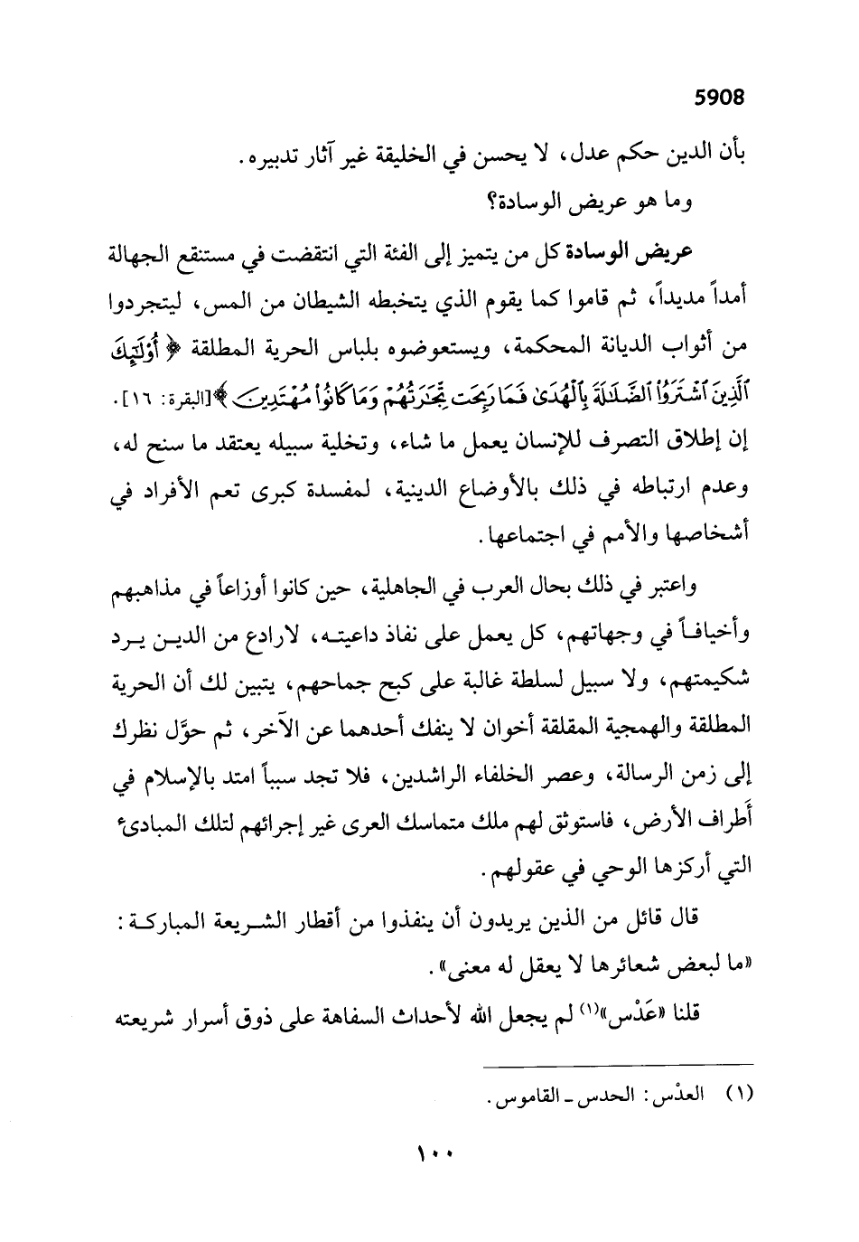 واعتبر في ذلك بحال العرب في الجاهلية، حين كانوا أوزاعاً في مذاهبهم وأخيافاً في وجهاتهم، كل يعمل على نفاذ داعيته، لا رادع من الدين يرد شكيمتهم، ولا سبيل لسلطة غالبة على كبح جماحهم، يتبين لك أن الحرية المطلقة والهمجية المقلقة أخوان لا ينفك أحدهما عن الآخر، ثم حوَّل نظرك إلى زمن الرسالة، وعصر الخلفاء الراشدين، فلا تجد سبباً امتد بالإِسلام في أَطراف الأرض، فاستوثق لهم ملك متماسك العرى غير إجرائهم لتلك المبادئ التي أركزها الوحي في عقولهم.
