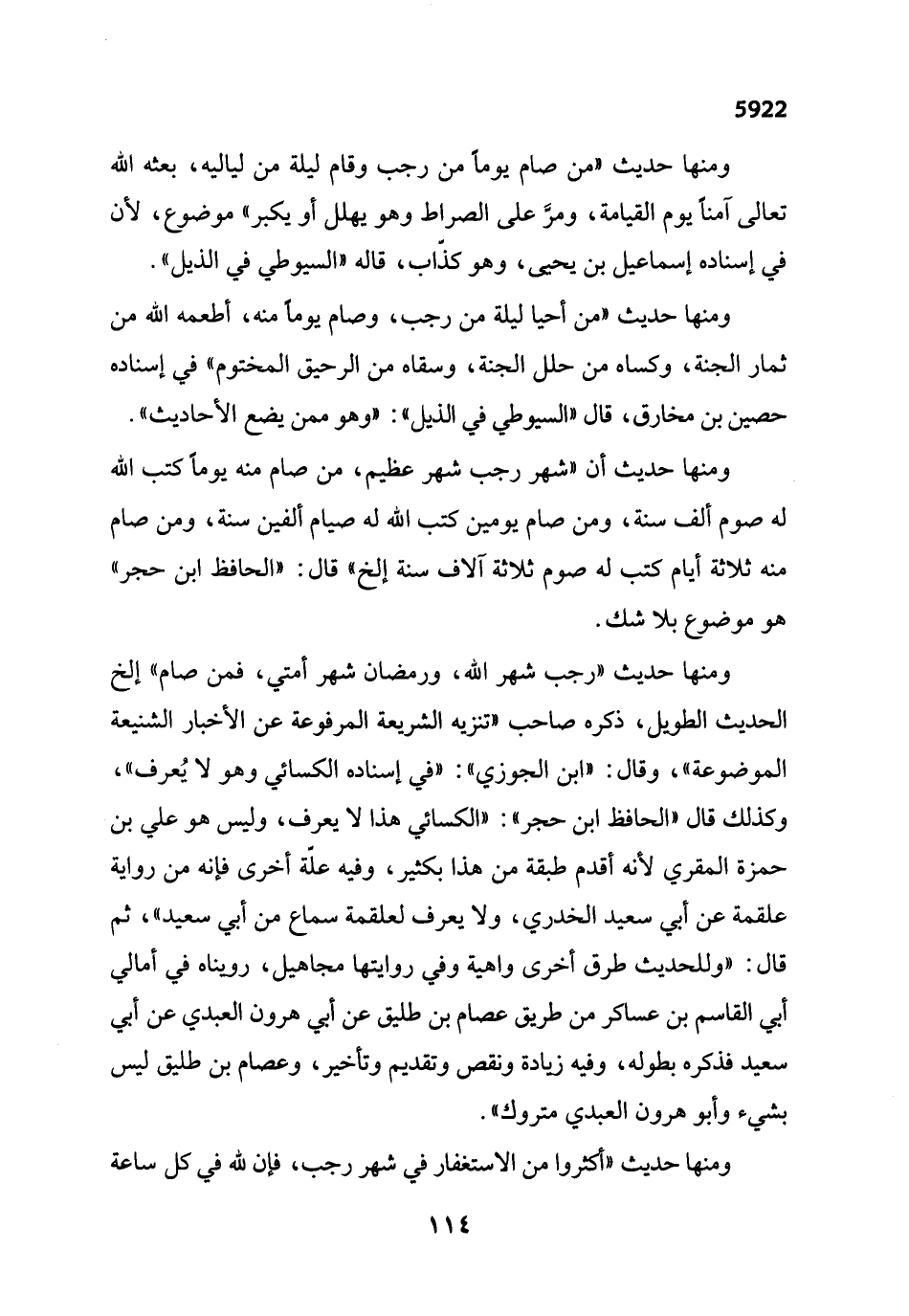 ومنها حديث أن "شهر رجب شهر عظيم، من صام منه يوماً كتب الله له صوم ألف سنة، ومن صام يومين كتب الله له صيام ألفين سنة، ومن صام منه ثلاثة أيام كتب له صوم ثلاثة آلاف سنة إلخ" قال: "الحافظ ابن حجر" هو موضوع بلا شك.