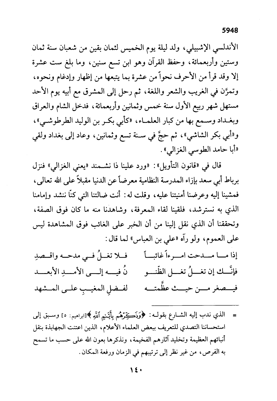 = الذي ندب إليه الشارع بقوله: {وَذَكِّرْهُمْ بِأَيَّامِ اللَّهِ} [إبراهيم: 5] وسبق إلى استحساننا التصدي للتعريف ببعض العلماء الأعلام، الذين اعتنت الجهابذة بنقل أنبائهم العظيمة وتخليد آثارهم الفخيمة، ونذكرها بعون الله على حسب ما تسمح به الفرص، من غير نظر إلى ترتيبهم في الزمان ورفعة المكان.