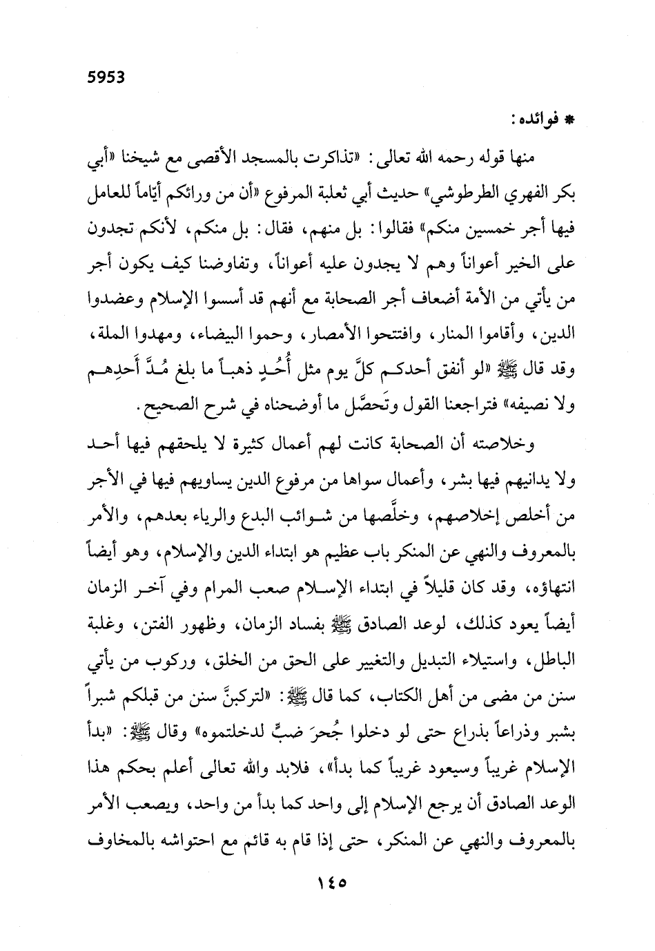 وخلاصته أن الصحابة كانت لهم أعمال كثيرة لا يلحقهم فيها أحد ولا يدانيهم فيها بشر، وأعمال سواها من مرفوع الدين يساويهم فيها في الأجر من أخلص إخلاصهم، وخلَّصها من شوائب البدع والرياء بعدهم، والأمر بالمعروف والنهي عن المنكر باب عظيم هو ابتداء الدين والإِسلام، وهو أيضاً انتهاؤه، وقد كان قليلاً في ابتداء الإِسلام صعب المرام وفي آخر الزمان أيضاً يعود كذلك، لوعد الصادق - صلى الله عليه وسلم - بفساد الزمان، وظهور الفتن، وغلبة الباطل، واستيلاء التبديل والتغيير على الحق من الخلق، وركوب من يأتي سنن من مضى من أهل الكتاب، كما قال - صلى الله عليه وسلم -: "لتركبنَّ سنن من قبلكم شبراً بشير وذراعاً بذراع حتى لو دخلوا جُحرَ ضبٍّ لدخلتموه" وقال - صلى الله عليه وسلم -: "بدأ الإِسلام غريباً وسيعود غريباً كما بدأ"، فلابد والله تعالى أعلم بحكم هذا الوعد الصادق أن يرجع الإِسلام إلى واحد كما بدأ من واحد، ويصعب الأمر بالمعروف والنهي عن المنكر، حتى إذا قام به قائم مع احتواشه بالمخاوف