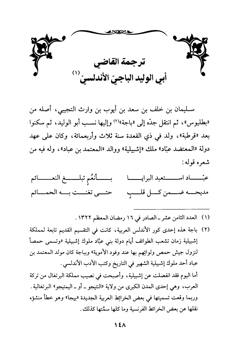 سليمان بن خلف بن سعد بن أيوب بن وارث التجيبي، أصله من "بطليوس"، ثم انتقل جدّه إلى "باجة" (¬2) وإليها نسب أبو الوليد، ثم سكنوا بعد "قرطبة"، ولد في ذي القعدة سنة ثلاث وأربعمائة، وكان على عهد دولة "المعتضد عبّاد" ملك "إشبيلية" ووالد "المعتمد بن عباد"، وله فيه من شعره قوله: