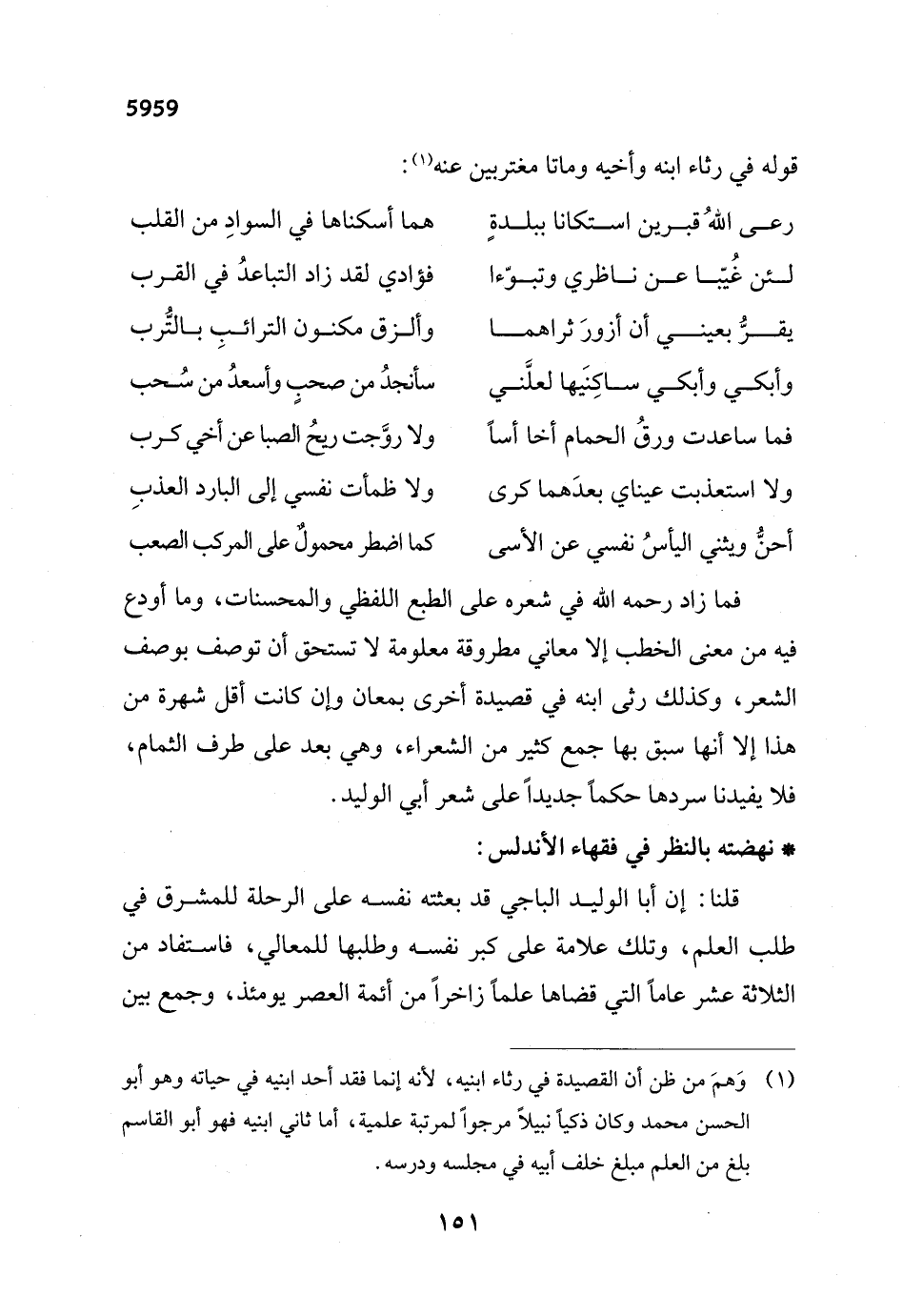 (¬1) وَهمَ من ظن أن القصيدة في رثاء ابنيه, لأنه إنما فقد أحد ابنيه في حياته وهو أبو الحسن محمد وكان ذكياً نبيلاً مرجواً لمرتبة علمية، أما ثاني ابنيه فهو أبو القاسم بلغ من العلم مبلغ خلف أبيه في مجلسه ودرسه.