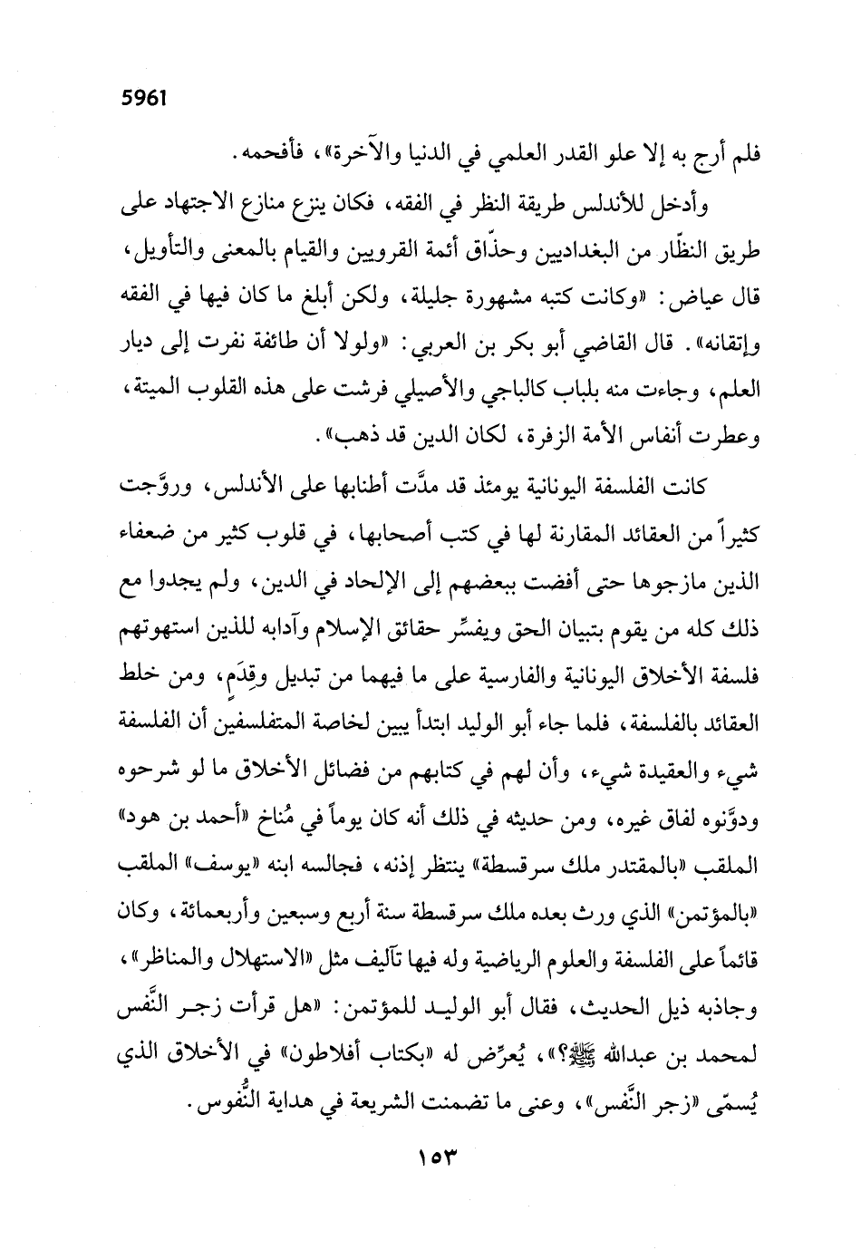 كانت الفلسفة اليونانية يومئذ قد مدَّت أطنابها على الأندلس، وروَّجت كثيراً من العقائد المقارنة لها في كتب أصحابها، في قلوب كثير من ضعفاء الذين مازجوها حتى أفضت ببعضهم إلى الإلحاد في الدين، ولم يجدوا مع ذلك كله من يقوم بتبيان الحق ويفسِّر حقائق الإِسلام وآدابه للذين استهوتهم فلسفة الأخلاق اليونانية والفارسية على ما فيهما من تبديل وقِدَمٍ، ومن خلط العقائد بالفلسفة، فلما جاء أبو الوليد ابتدأ يبين لخاصة المتفلسفين أن الفلسفة شيء والعقيدة شيء، وأن لهم في كتابهم من فضائل الأخلاق ما لو شرحوه ودوَّنوه لفاق غيره، ومن حديثه في ذلك أنه كان يوماً في مُناخ "أحمد بن هود" الملقب "بالمقتدر ملك سرقسطة" ينتظر إذنه، فجالسه ابنه "يوسف" الملقب "بالمؤتمن" الذي ورث بعده ملك سرقسطة سنة أربع وسبعين وأربعمائة، وكان قائماً على الفلسفة والعلوم الرياضية وله فيها تآليف مثل "الاستهلال والمناظر"، وجاذبه ذيل الحديث، فقال أبو الوليد للمؤتمن: "هل قرأت زجر النَّفس لمحمد بن عبد الله - صلى الله عليه وسلم -؟ "، يُعرِّض له "بكتاب أفلاطون" في الأخلاق الذي يُسمّى "زجر النَّفس"، وعنى ما تضمنت الشريعة في هداية النُّفوس.