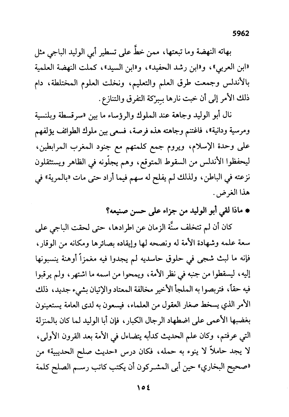 كان أن لم تتخلف سنَّة الزمان عن اطرادها، حتى لحقت الباجي على سعة علمه وشهادة الأمة له ونصحه لها وإيقاده بصائرها ومكانه من الوقار، فإنه ما لبث شجى في حلوق حاسديه لم يجدوا فيه مغمزاً أوهنة ينسبونها إليه، ليسقطوا من جنبه في نظر الأمة، ويمحوا من اسمه ما اشتهر، ولم يرقبوا فيه حقاً، فتربصوا به الملجأ الأخير مخالفة المعتاد والإتيان بشيء جديد، ذلك الأمر الذي يسخط صغار العقول من العلماء، فيسعون به لدى العامة يستعينون بغضبها الأعمى على اضطهاد الرجال الكبار، فإن أبا الوليد لما كان بالمنزلة التي عرفتم، وكان علم الحديث كدأبه يتضاءل في الأمة بعد القرون الأولى، لا يجد حاملاً لا ينوء به حمله، فكان درس "حديث صلح الحديبية" من "صحيح البخاري" حين أبي المشركون أن يكتب كاتب رسم الصلح كلمة