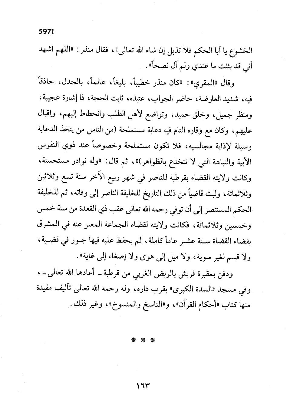 وقال "المقري": "كان منذر خطيباً، بليغاً، عالماً، بالجدل، حاذقاً فيه، شديد العارضة، حاضر الجواب، عتيده، ثابت الحجة، ذا إشارة عجيبة، ومنظر جميل، وخلق حميد، وتواضع لأهل الطلب وانحطاط إليهم، وإقبال عليهم، وكان مع وقاره التام فيه دعابة مستملحة (من الناس من يتخذ الدعابة وسيلة لإذاية مجالسيه، فلا تكون مستملحة وخصوصاً عند ذوي النفوس الأبية والنباهة التي لا تنخدع بالظواهر) "، ثم قال: "وله نوادر مستحسنة، وكانت ولايته القضاء بقرطبة للناصر في شهر ربيع الآخر سنة تسع وثلاثين وثلاثمائة، ولبث قاضياً من ذلك التاريخ للخليفة الناصر إلى وفاته، ثم للخليفة الحكم المستنصر إلى أن توفي -رحمه الله تعالى- عقب ذي القعدة من سنة خمس وخمسين وثلاثمائة، فكانت ولايته لقضاء الجماعة المعبر عنه في المشرق بقضاء القضاة ستة عشر عاماً كاملة، لم يحفظ عليه فيها جور في قضية، ولا قسم لغير سوية، ولا ميل إلى هوى ولا إصغاء إلى غاية".