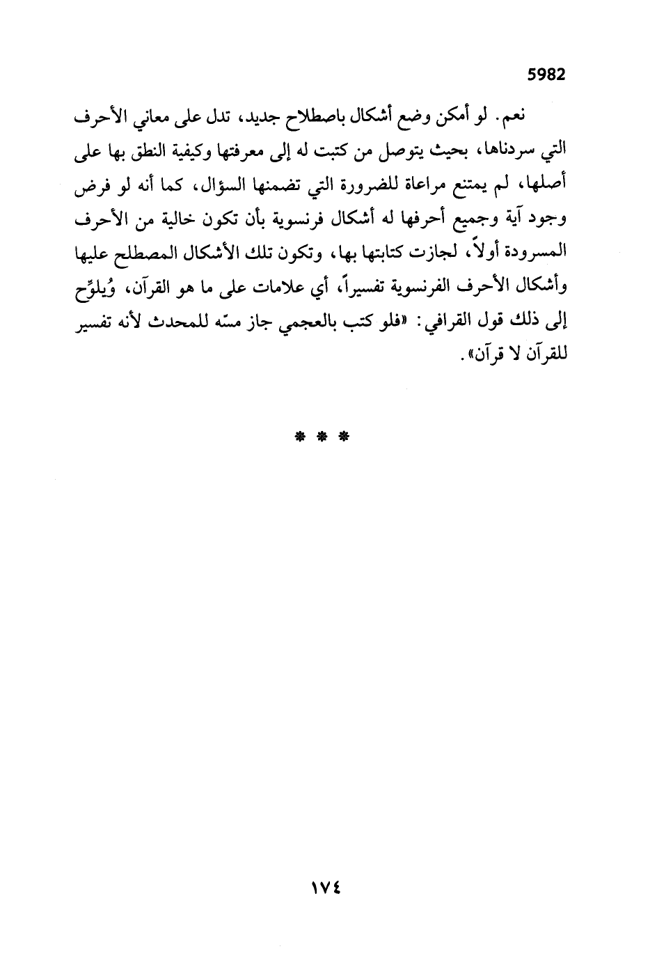 نعم. لو أمكن وضع أشكال باصطلاح جديد، تدل على معاني الأحرف التي سردناها، بحيث يتوصل من كتبت له إلى معرفتها وكيفية النطق بها على أصلها, لم يمتنع مراعاة للضرورة التي تضمنها السؤال، كما أنه لو فرض وجود آية وجميع أحرفها له أشكال فرنسوية بأن تكون خالية من الأحرف المسرودة أولاً، لجازت كتابتها بها، وتكون تلك الأشكال المصطلح عليها وأشكال الأحرف الفرنسوية تفسيراً، أي علامات على ما هو القرآن، وُيلوِّح إلى ذلك قول القرافي: "فلو كتب بالعجمي جاز مسّه للمحدث لأنه تفسير للقرآن لا قرآن".
