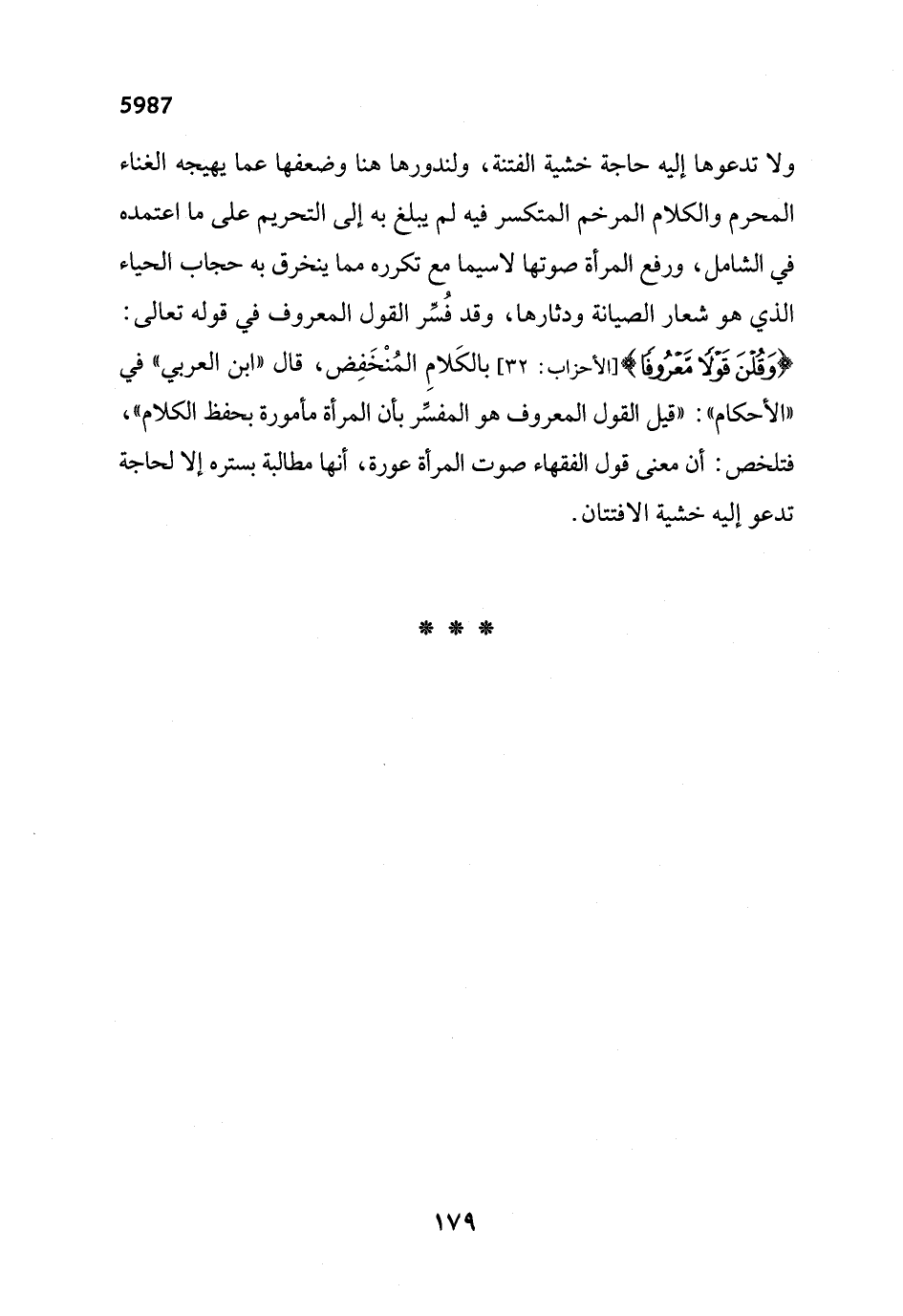 ولا تدعوها إليه حاجة خشية الفتنة، ولندورها هنا وضعفها عما يهيجه الغناء المحرم والكلام المرخم المتكسر فيه لم يبلغ به إلى التحريم على ما اعتمده في الشامل، ورفع المرأة صوتها لا سيما مع تكرره مما ينخرق به حجاب الحياء الذي هو شعار الصيانة ودثارها، وقد فُسِّر القول المعروف في قوله تعالى: {وَقُلْنَ قَوْلًا مَعْرُوفًا} [الأحزاب: 32] بالكَلامِ المُنْخَفِض، قال "ابن العربي" في "الأحكام": "قيل القول المعروف هو المفسِّر بأن المرأة مأمورة بحفظ الكلام"، فتلخص: أن معنى قول الفقهاء صوت المرأة عورة، أنها مطالبة بستره إلا لحاجة تدعو إليه خشية الافتتان.