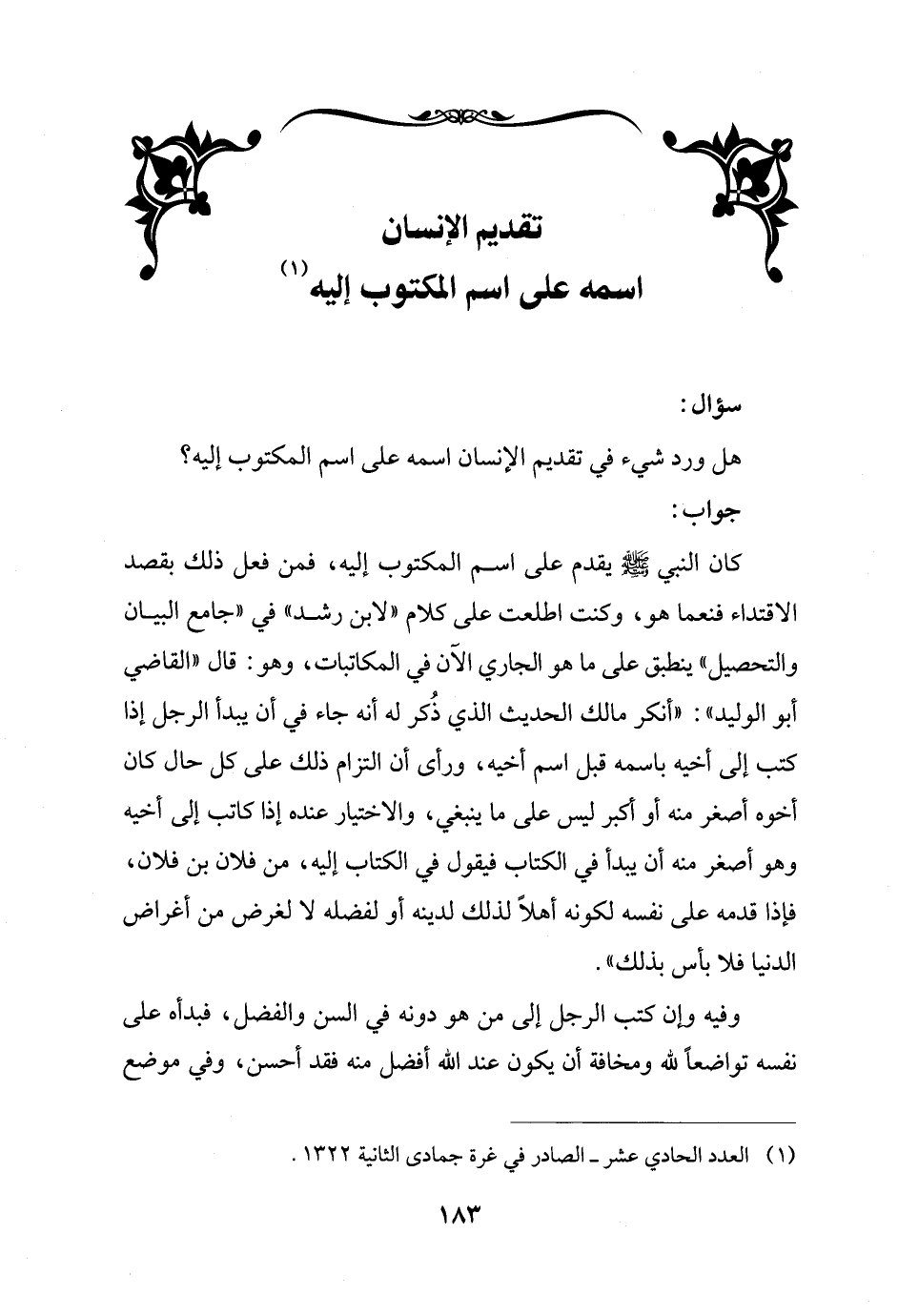 كان النبي - صلى الله عليه وسلم - يقدم على اسم المكتوب إليه، فمن فعل ذلك بقصد الاقتداء فنعما هو، وكنت اطلعت على كلام "لابن رشد" في "جامع البيان والتحصيل" ينطبق على ما هو الجاري الآن في المكاتبات، وهو: قال "القاضي أبو الوليد": "أنكر مالك الحديث الذي ذُكر له أنه جاء في أن يبدأ الرجل إذا كتب إلى أخيه باسمه قبل اسم أخيه، ورأى أن التزام ذلك على كل حال كان أخوه أصغر منه أو أكبر ليس على ما ينبغي، والاختيار عنده إذا كاتب إلى أخيه وهو أصغر منه أن يبدأ في الكتاب فيقول في الكتاب إليه، من فلان بن فلان، فإذا قدمه على نفسه لكونه أهلاً لذلك لدينه أو لفضله لا لغرض من أغراض الدنيا فلا بأس بذلك".