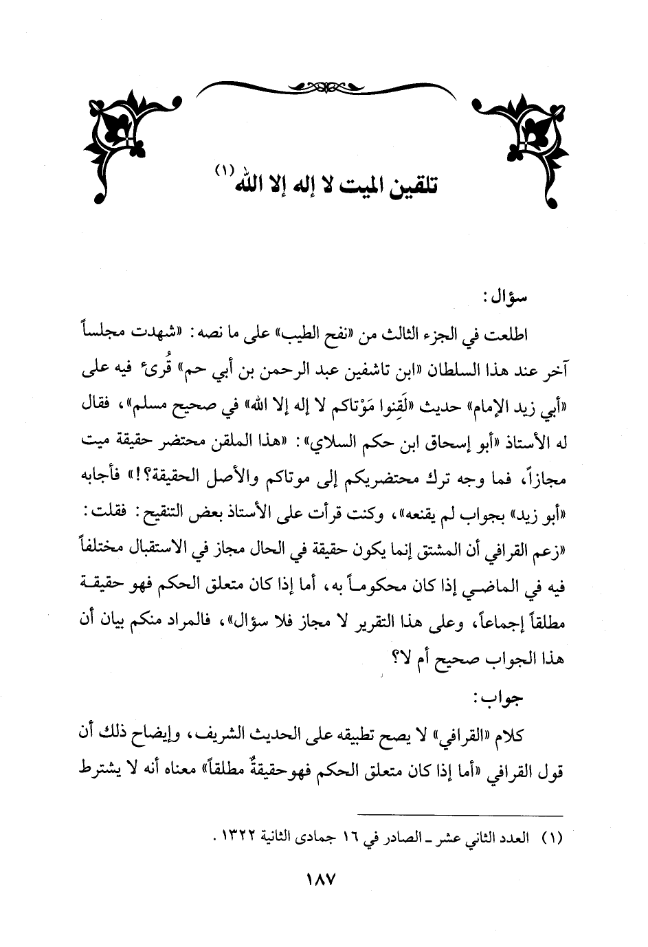 اطلعت في الجزء الثالث من "نفح الطيب" على ما نصه: "شهدت مجلساً آخر عند هذا السلطان "ابن تاشفين عبد الرحمن بن أبي حم" قُرئ فيه على "أبي زيد الإِمام" حديث "لَقِنوا مَوْتاكم لا إله إلا الله" في صحيح مسلم"، فقال له الأستاذ "أبو إسحاق ابن حكم السلاي": "هذا الملقن محتضر حقيقة ميت مجازاً، فما وجه ترك محتضريكم إلى موتاكم والأصل الحقيقة؟! " فأجابه "أبو زيد" بجواب لم يقنعه"، وكنت قرأت على الأستاذ بعض التنقيح: فقلت: "زعم القرافي أن المشتق إنما يكون حقيقة في الحال مجاز في الاستقبال مختلفاً فيه في الماضي إذا كان محكوماً به، أما إذا كان متعلق الحكم فهو حقيقة مطلقاً إجماعاً، وعلى هذا التقرير لا مجاز فلا سؤال"، فالمراد منكم بيان أن هذا الجواب صحيح أم لا؟