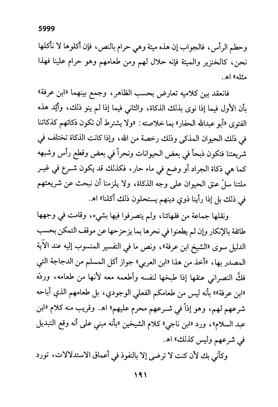 ونقلها جماعة من فقهائنا, ولم يتصرفوا فيها بشيء، وقامت في وجهها طائفة بالإنكار وإن لم يطعنوا في نحرها بما يزحزحها عن موقف التمكن بحسب الدليل سوى "الشيخ ابن عرفة"، ونص ما في التفسير المنسوب إليه عند الآية المصدر بها، "أخذ من هذا "ابن العربي" جواز أكل المسلم من الدجاجة التي فكَّ النصراني عنقها إذا طبخها لنفسه وأطعمه معه لأنها من طعامه، وردّه "ابن عرفة" بأنه ليس من طعامكم الفعلي الوجودي، بل طعامهم الذي أباحه شرعهم لهم، وهو إذاً في شرعهم محرم عليهم" اهـ. وقريب منه كلام "ابن عبد السلام "، ورد "ابن ناجي" كلام الشيخين "بأنه مبني على أنه وقع التبديل في شرعهم وليس كذلك" اهـ.