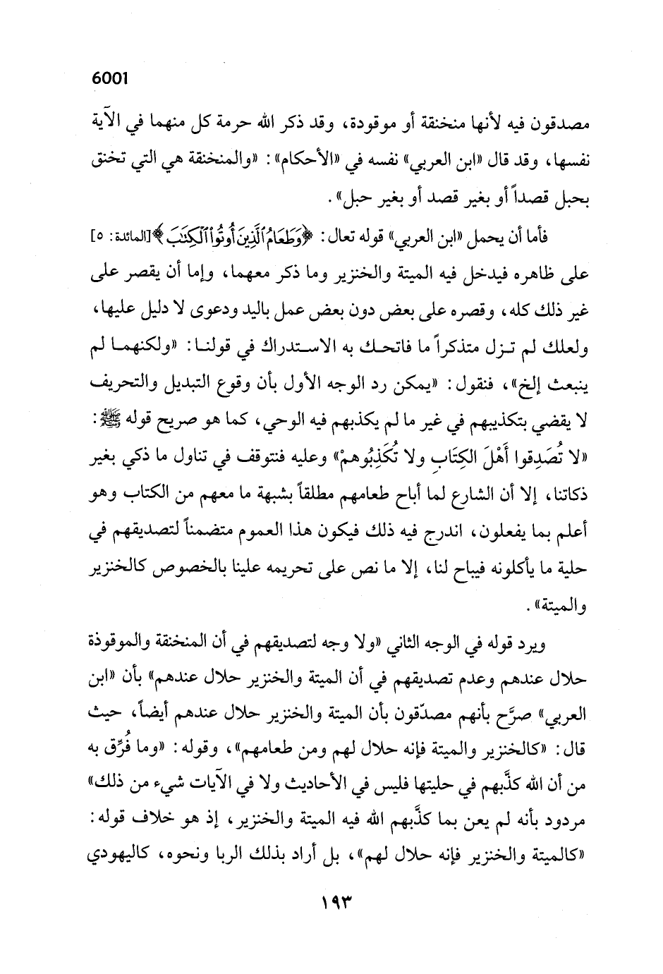 ويرد قوله في الوجه الثاني "ولا وجه لتصديقهم في أن المنخنقة والموقوذة حلال عندهم وعدم تصديقهم في أن الميتة والخنزير حلال عندهم" بأن "ابن العربي" صرَّح بأنهم مصدّقون بأن الميتة والخنزير حلال عندهم أيضاً، حيث قال: "كالخنزير والميتة فإنه حلال لهم ومن طعامهم"، وقوله: "وما فُرِّق به من أن الله كذَّبهم في حليتها فليس في الأحاديث ولا في الآيات شيء من ذلك" مردود بأنه لم يعن بما كذَّبهم الله فيه الميتة والخنزير، إذ هو خلاف قوله: "كالميتة والخنزير فإنه حلال لهم"، بل أراد بذلك الربا ونحوه، كاليهودي