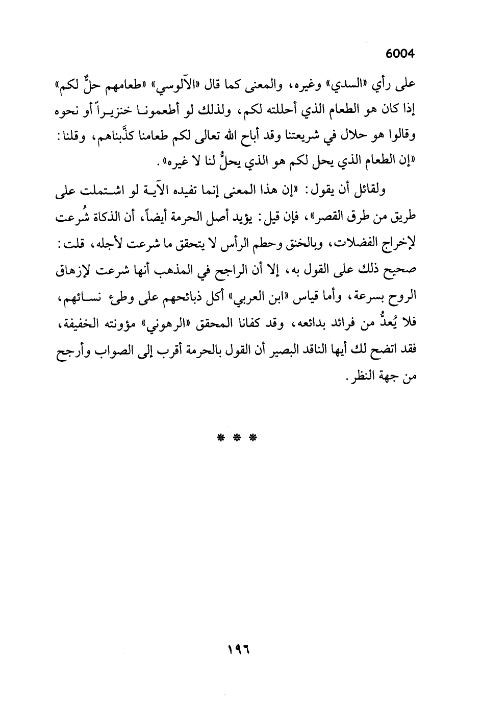 ولقائل أن يقول: "إن هذا المعنى إنما تفيده الآية لو اشتملت على طريق من طرق القصر"، فإن قيل: يؤيد أصل الحرمة أيضاً، أن الذكاة شُرعت لإخراج الفضلات، وبالخنق وحطم الرأس لا يتحقق ما شرعت لأجله، قلت: صحيح ذلك على القول به، إلا أن الراجح في المذهب أنها شرعت لإزهاق الروح بسرعة، وأما قياس "ابن العربي" أكل ذبائحهم على وطئ نسائهم، فلا يُعدُّ من فرائد بدائعه، وقد كفانا المحقق "الرهوني" مؤونته الخفيفة، فقد اتضح لك أيها الناقد البصير أن القول بالحرمة أقرب إلى الصواب وأرجح من جهة النظر.