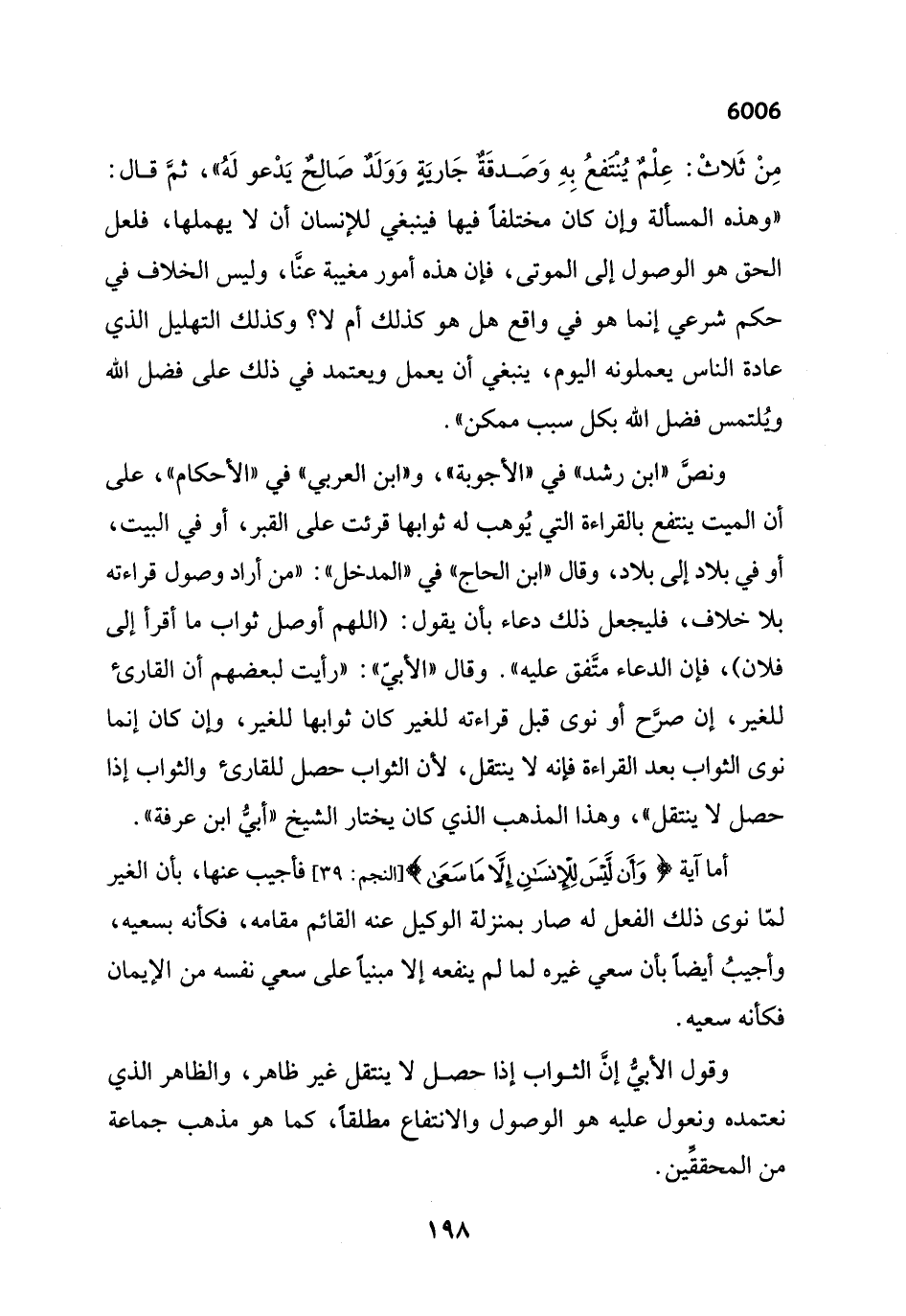 مِنْ ثَلاثْ: عِلْمٌ يُنتفعُ بِهِ وَصَدقَةٌ جَارَيةٍ وَوَلَدٌ صالح يَدْعو لَه"، ثم قال: "وهذه المسألة وإن كان مختلفاً فيها فينبغي للإنسان أن لا يهملها، فلعل الحق هو الوصول إلى الموتى، فإن هذه أمور مغيبة عنَّا, وليس الخلاف في حكم شرعي إنما هو في واقع هل هو كذلك أم لا؟ وكذلك التهليل الذي عادة الناس يعملونه اليوم، ينبغي أن يعمل ويعتمد في ذلك على فضل الله ويُلتمس فضل الله بكل سبب ممكن".
