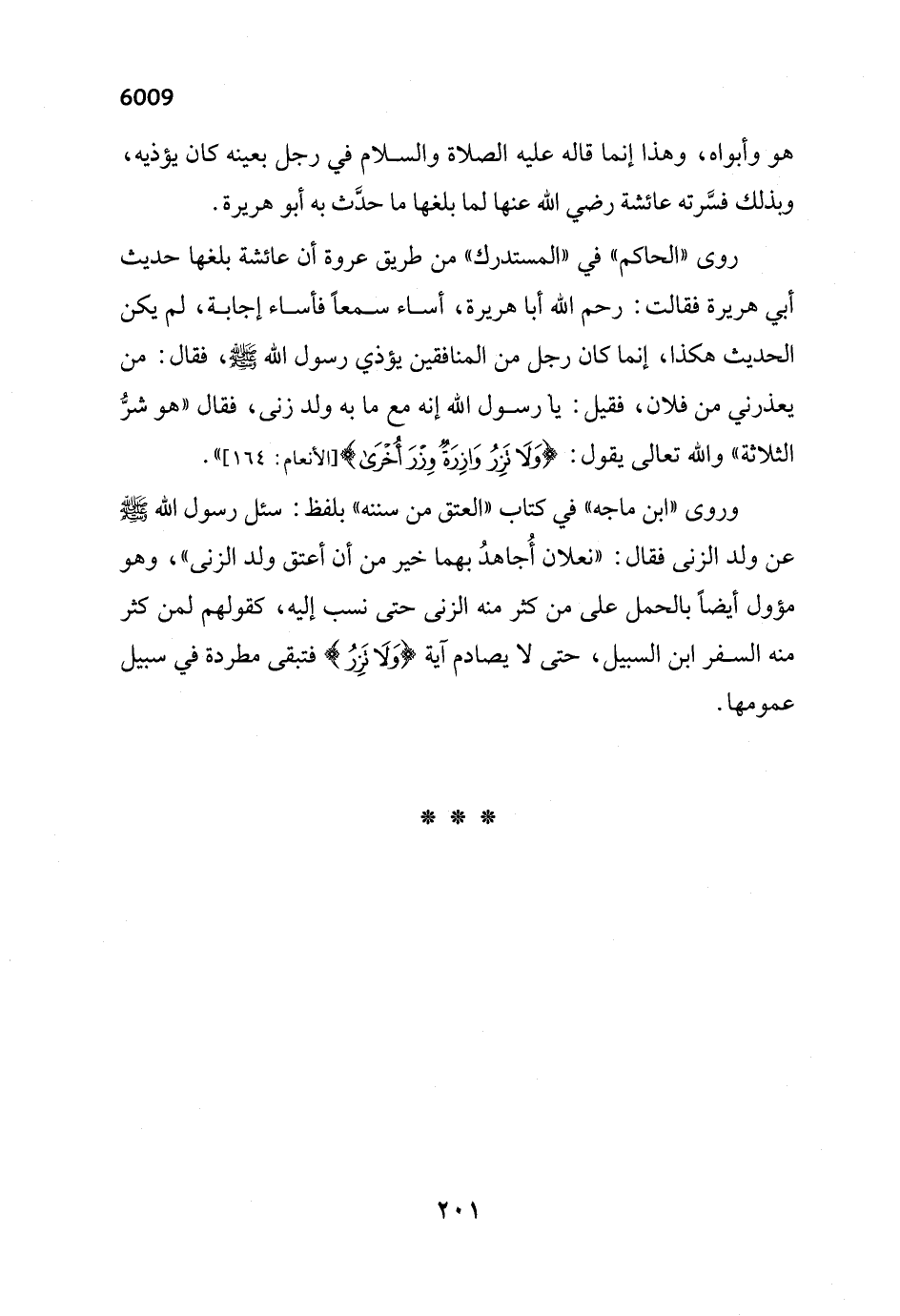 روى "الحاكم" في "المستدرك" من طريق عروة أن عائشة بلغها حديث أبي هريرة فقالت: رحم الله أبا هريرة، أساء سمعاً فأساء إجابة، لم يكن الحديث هكذا، إنما كان رجل من المنافقين يؤذي رسول الله - صلى الله عليه وسلم -، فقال: من يعذرني من فلان، فقيل: يا رسول الله إنه مع ما به ولد زنى، فقال "هو شرُّ الثلاثة" والله تعالى يقول: {وَلَا تَزِرُ وَازِرَةٌ وِزْرَ أُخْرَى} [الأنعام: 164] ".